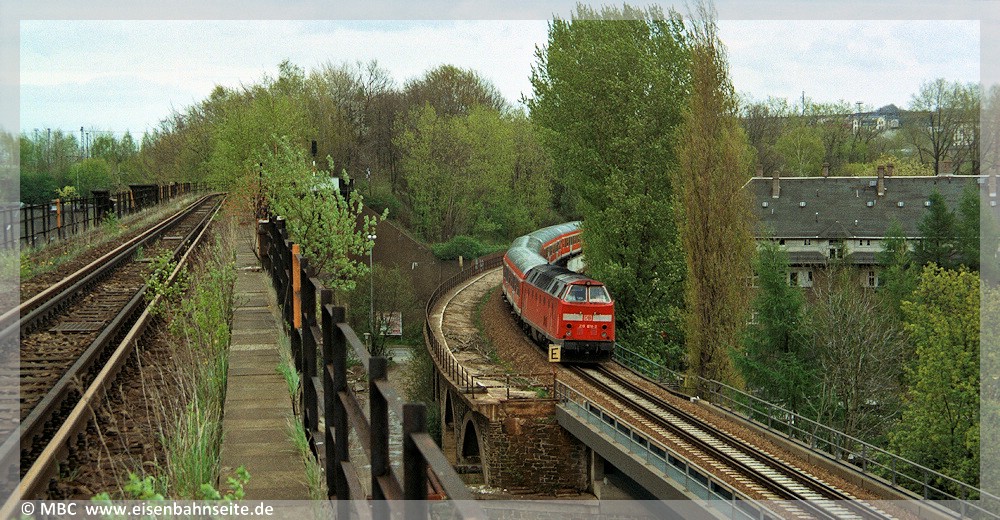 [1] Als 228 745 am 08.03.1993 mit N 5778 nach Burgstädt über das Bauwerk schleicht, befand sich dieses noch weitgehend im Originalzustand. Das zweite Streckengleis ist längst demontiert, aber die Brücke existiert noch in voller Breite. Im Vordergrund sieht man auch das Anschlussgleis zum Webstuhlbau, welches bis Anfang der 1970er-Jahre auch weiter zum E-Werk an der Müllerstraße führte. Heute führt an dieser Stelle der Chemnitztalradweg durch die Brücke. Aufnahme: Dirk Schüttler