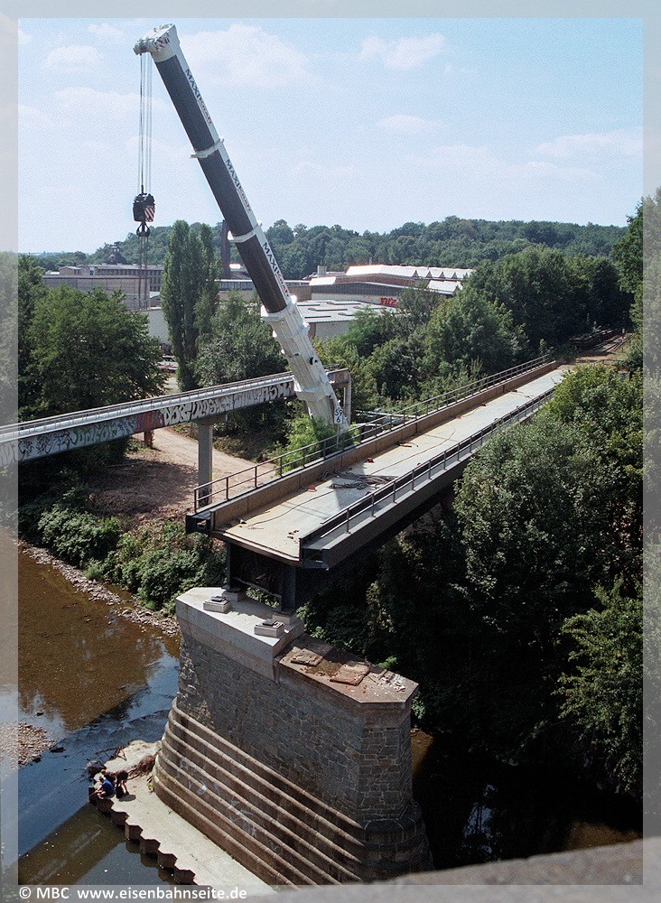 [3] Auch am 02.12.2001 fahren die Züge noch im Schritttempo über die Chemnitz. Dennoch hat sich vieles verändert. Das vertraute „Klappern“ bei der Überfahrt ist vorbei und die Brücke ist nur noch halb so breit. Im Vergleich zum vorigen Bild fahren die Züge nun weiter rechts (Blickrichtung) über die 1999 ausgetauschten Brückenträger.