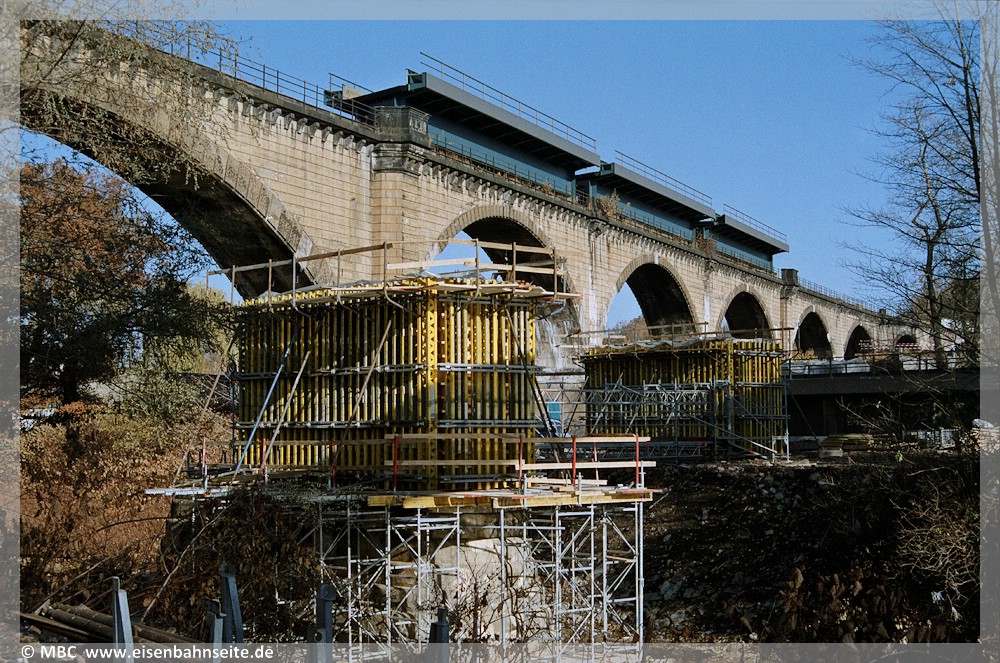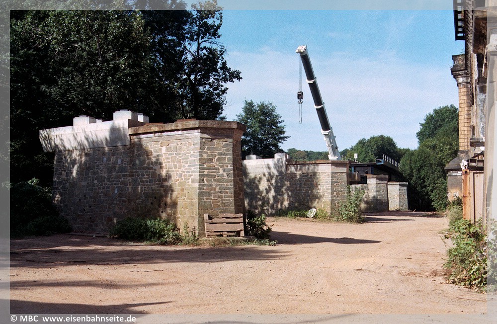 [8] Die spektakuläre Brückenbaustelle soll nun aus weiteren Perspektiven gezeigt werden. Wir blicken auf den in der Chemnitz stehenden Pfeiler (August 2003).