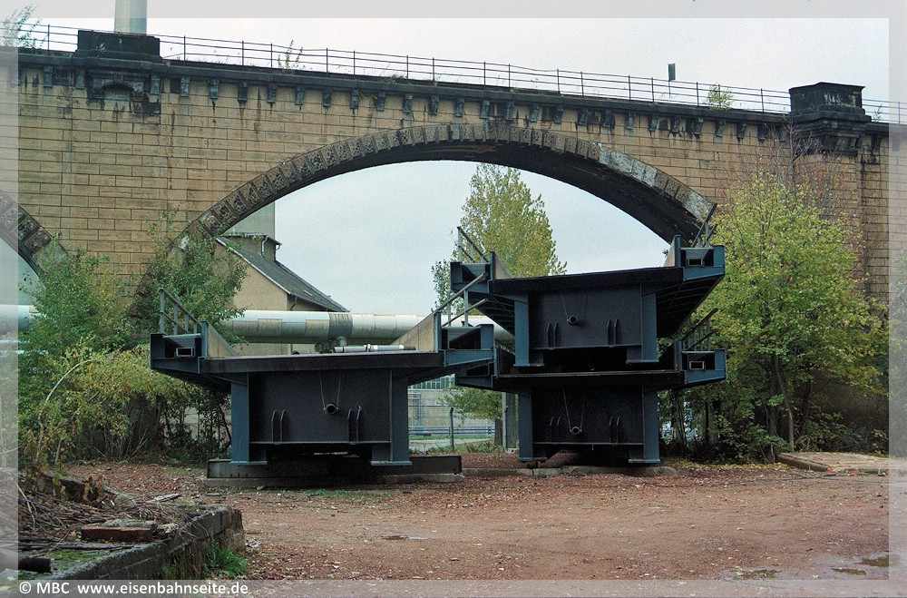 [9] Ein kurioses Bild geben die aufgestapelten Brückenträger unter dem Viadukt der Güterzugstrecke nach Hilbersdorf ab. In der Lage der rechten Träger befand sich das Anschlussgleis zum Webstuhlbau. Rechts kann man noch eine Pfeiftafel davon erkennen (26.10.2003).