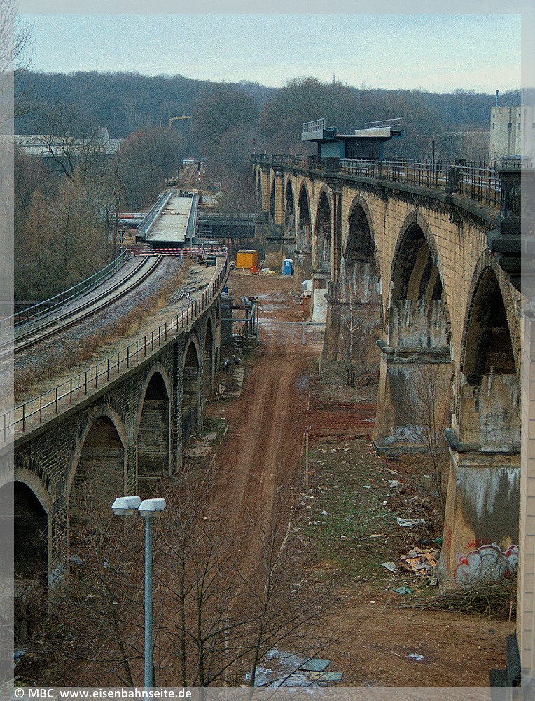 [14] Ein letzter Bildvergleich: Blick in Richtung Küchwald, die Pfeiler sind am 30.12.2003 bereits fertiggestellt. Noch wird an den Widerlagern gearbeitet und die beiden äußeren Brückenträger warten noch auf den Wiedereinbau.