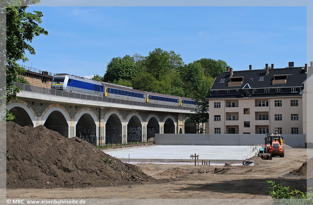 [15] Im März 2004 rollt der Zugverkehr wieder über dem Tal der Chemnitz. Nun können auch wieder Loks der Baureihe 232 fahren. Im Sperrungszeitraum wurde auch die Brücke über die Blankenburgstraße (hinten im Rechtsbogen) durch einen Neubau ersetzt. Ein RS1 der City-Bahn hat gleich den Chemnitzer Hbf erreicht. Das hier noch vorhandene Gleis der KCCh samt Küchwalder Einfahrsignal gibt es längst nicht mehr.