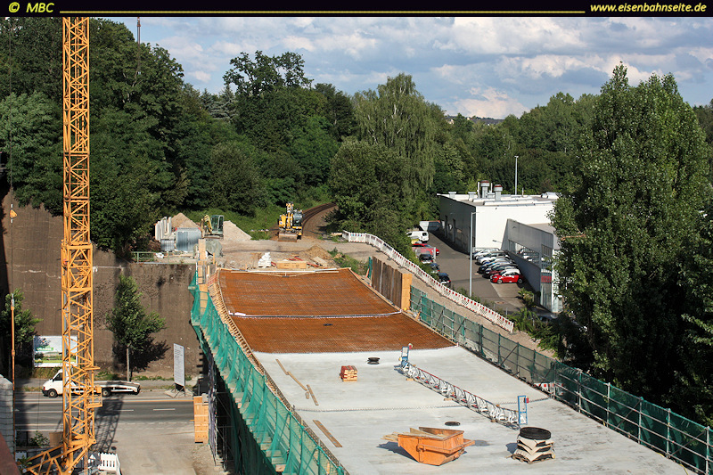 [] Der Bauzustand am 21. Juli 2019. Die Betonfahrbahnwanne ist in Höhe der Straßenquerung noch nicht fertig.