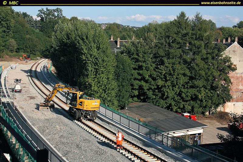 [] Der Zweiwegebagger verteilt den Schotter auf dem Planum des ehemals zweiten Gleises. Der Schotterzug wartet schon im Hbf.