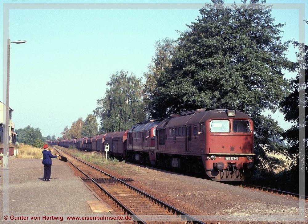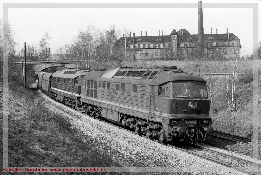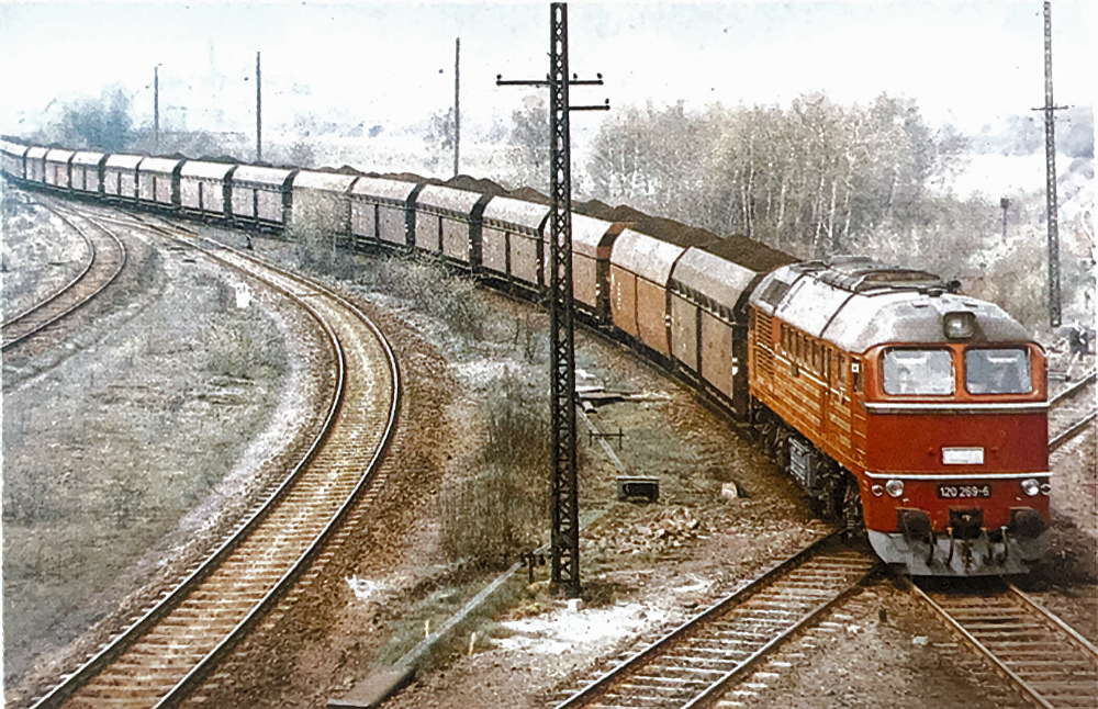 Über die Kohletransporte zu DDR-Zeiten – insbesondere in den 1960er-/1970er-Jahren – liegt nur wenig Bild- und Datenmaterial vor. Als gesichert gilt, dass die Braunkohle stets aus Tagebauen des Mitteldeutschen Reviers bezogen worden ist, bis 1997 vorrangig aus dem Tagebau Zwenkau. Bis Mitte 1997 nutzten die Kohlezüge die mittlerweile stillgelegte Nebenbahn Pegau – Groitzsch – Neukieritzsch bzw. das Reststück Zwenkau – Groitzsch der Strecke Gaschwitz – Meuselwitz auf ihrem Weg nach Chemnitz. Als beide Heizkraftwerke in Betrieb waren – 1987-1997 – verkehrten in Spitzenzeiten bis zu sechs Zugpaare pro Tag! Die Traktion oblag in der Anfangszeit den Baureihen 50 und 120. In den 1980er-Jahren dominierte die Baureihe 132 (ab 1992: 232) im Abschnitt Borna – Küchwald. Vereinzelt kam auch die BR 131 (ab 1992: 231, eine Splittergattung der BR 130 mit geänderter Achsgetriebeübersetzung) zum Einsatz. In den 1980er-Jahren übernahmen die Hilbersdorfer 120 oder 132 in Borna die Kohlependel von Altenburger oder Zeitzer 120, die ihn von Zwenkau bis dahin brachten.[4] Das Wagenmaterial bestand stets aus vierachsigen, offenen Drehgestell-Schüttgutwagen mit schlagartiger Schwerkraftentladung. Die konkrete Wagenbauart wechselte mehrfach. Die DDR-Zeit prägten vor allem die OOt 47 (zuletzt Fal 162) mit Drehgestellen der Bauart Niesky. Diese besaßen eine Dampfheizeinrichtung für den Laderaum.
