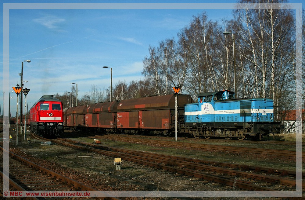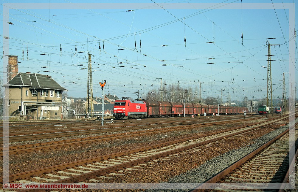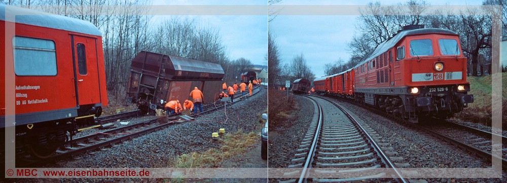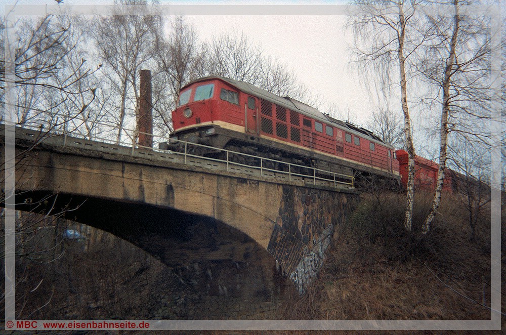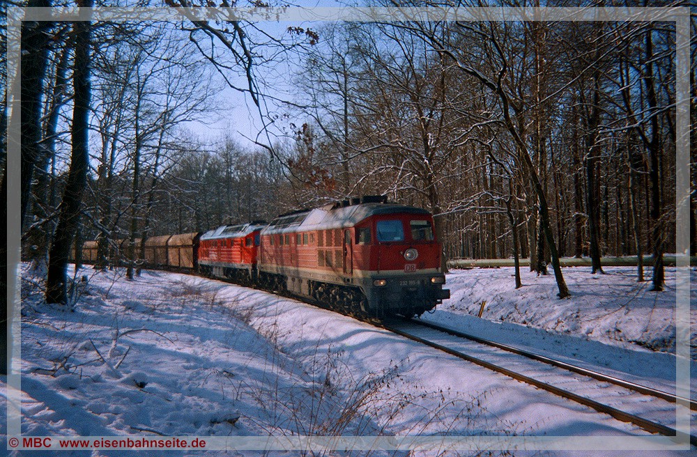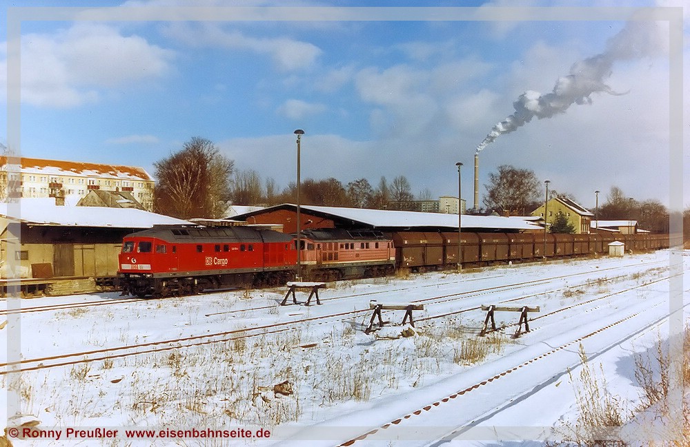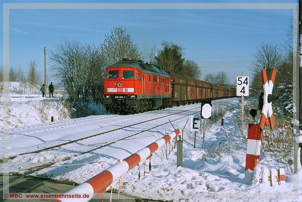 [51] An einem schönen Wintertag, dem 24. Januar 2004, zog 232 600 den nachmittäglichen Leerzug nach Profen durch Wittgensdorf Mitte. Am Zugschluss unterstützt 232 584 in der Steigung zum oberen Bahnhof.[52] In Neukieritzsch trennen sich die Strecken nach Hof und Chemnitz. 232 527 hat mit einem Vollzug nach Küchwald am 18. März 2004 den zweiten Weg eingeschlagen. Die Bespannung mit Zug- und Schublok war in dieser Zeit keine Seltenheit.[53] Ab Mitte 2004 fuhren die nachmittäglichen Leerzüge noch Profen auch oft auf Gleis 5 (Bahnsteig 12) durch die Chemnitzer Bahnhofshalle. Ein Lokwechsel war nicht mehr notwendig.[54] Ein Leerzug nach Profen stößt aus dem Anschlussbahnbereich in Richtung Chemnitz-Glösa auf die WbC zurück, um in Richtung Chemnitz Hbf zu gelangen. Die vordere Lok kennen wir bereits aus [42], es ist 232 195, nun in verkehrsrot mit dem seltenen, ersten Railion-Schriftzug.