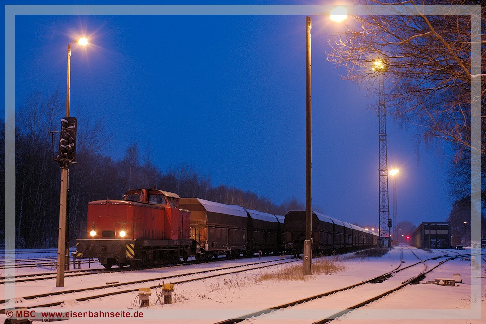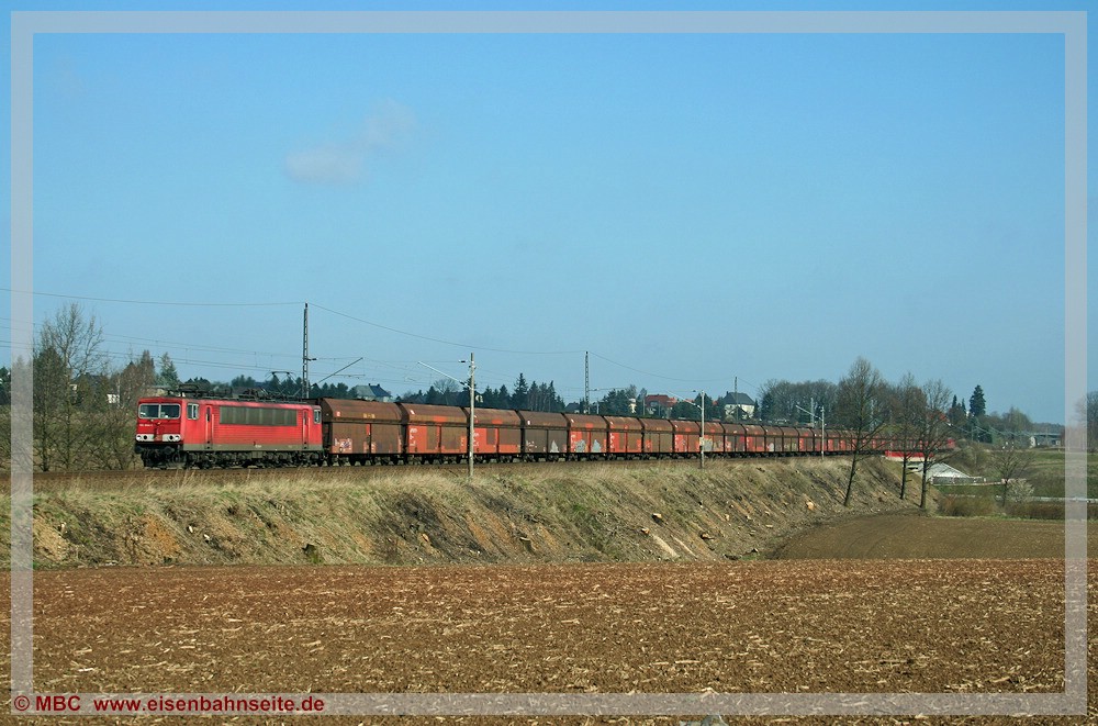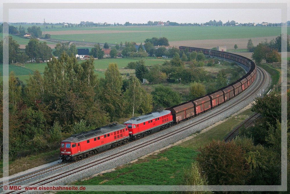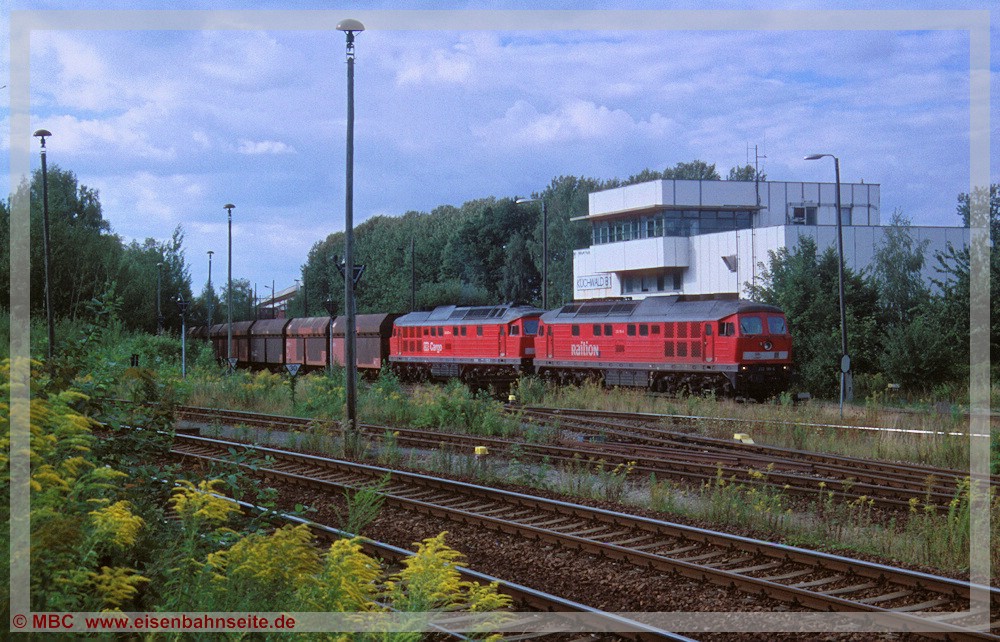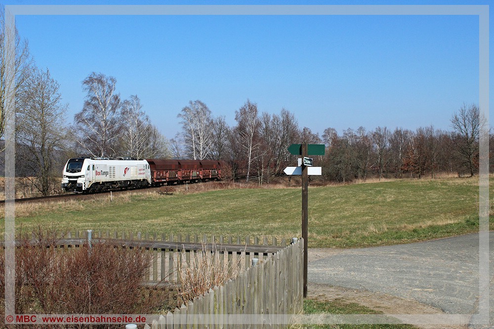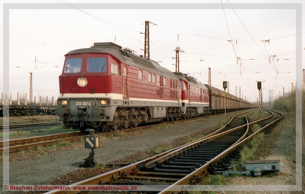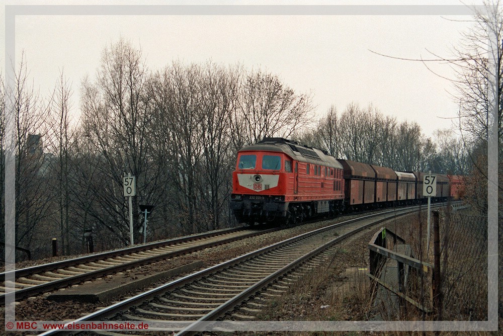[51] An einem schönen Wintertag, dem 24. Januar 2004, zog 232 600 den nachmittäglichen Leerzug nach Profen durch Wittgensdorf Mitte. Am Zugschluss unterstützt 232 584 in der Steigung zum oberen Bahnhof.[52] In Neukieritzsch trennen sich die Strecken nach Hof und Chemnitz. 232 527 hat mit einem Vollzug nach Küchwald am 18. März 2004 den zweiten Weg eingeschlagen. Die Bespannung mit Zug- und Schublok war in dieser Zeit keine Seltenheit.[53] Ab Mitte 2004 fuhren die nachmittäglichen Leerzüge noch Profen auch oft auf Gleis 5 (Bahnsteig 12) durch die Chemnitzer Bahnhofshalle. Ein Lokwechsel war nicht mehr notwendig.[54] Ein Leerzug nach Profen stößt aus dem Anschlussbahnbereich in Richtung Chemnitz-Glösa auf die WbC zurück, um in Richtung Chemnitz Hbf zu gelangen. Die vordere Lok kennen wir bereits aus [42], es ist 232 195, nun in verkehrsrot mit dem seltenen, ersten Railion-Schriftzug.