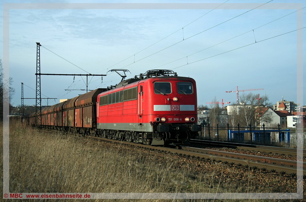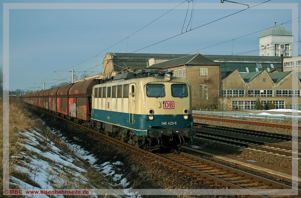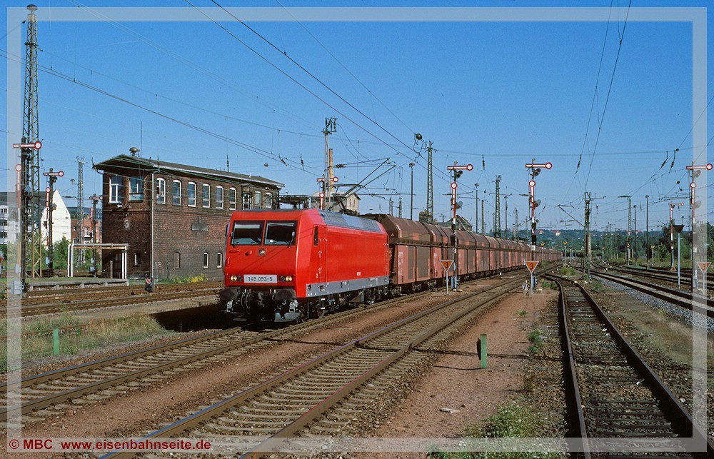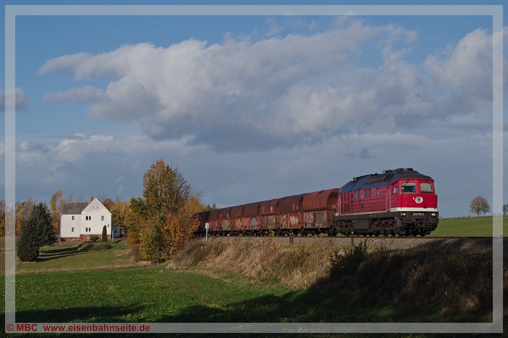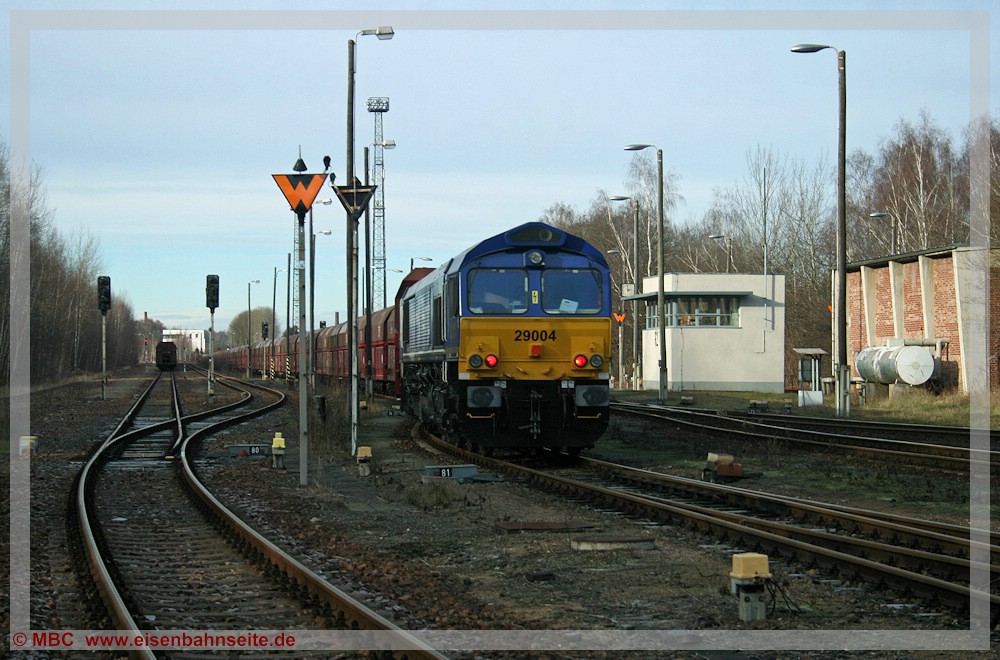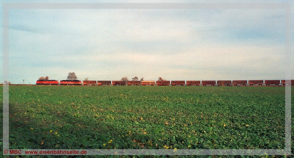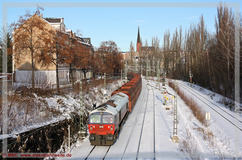 [51] An einem schönen Wintertag, dem 24. Januar 2004, zog 232 600 den nachmittäglichen Leerzug nach Profen durch Wittgensdorf Mitte. Am Zugschluss unterstützt 232 584 in der Steigung zum oberen Bahnhof.[52] In Neukieritzsch trennen sich die Strecken nach Hof und Chemnitz. 232 527 hat mit einem Vollzug nach Küchwald am 18. März 2004 den zweiten Weg eingeschlagen. Die Bespannung mit Zug- und Schublok war in dieser Zeit keine Seltenheit.[53] Ab Mitte 2004 fuhren die nachmittäglichen Leerzüge noch Profen auch oft auf Gleis 5 (Bahnsteig 12) durch die Chemnitzer Bahnhofshalle. Ein Lokwechsel war nicht mehr notwendig.[54] Ein Leerzug nach Profen stößt aus dem Anschlussbahnbereich in Richtung Chemnitz-Glösa auf die WbC zurück, um in Richtung Chemnitz Hbf zu gelangen. Die vordere Lok kennen wir bereits aus [42], es ist 232 195, nun in verkehrsrot mit dem seltenen, ersten Railion-Schriftzug.
