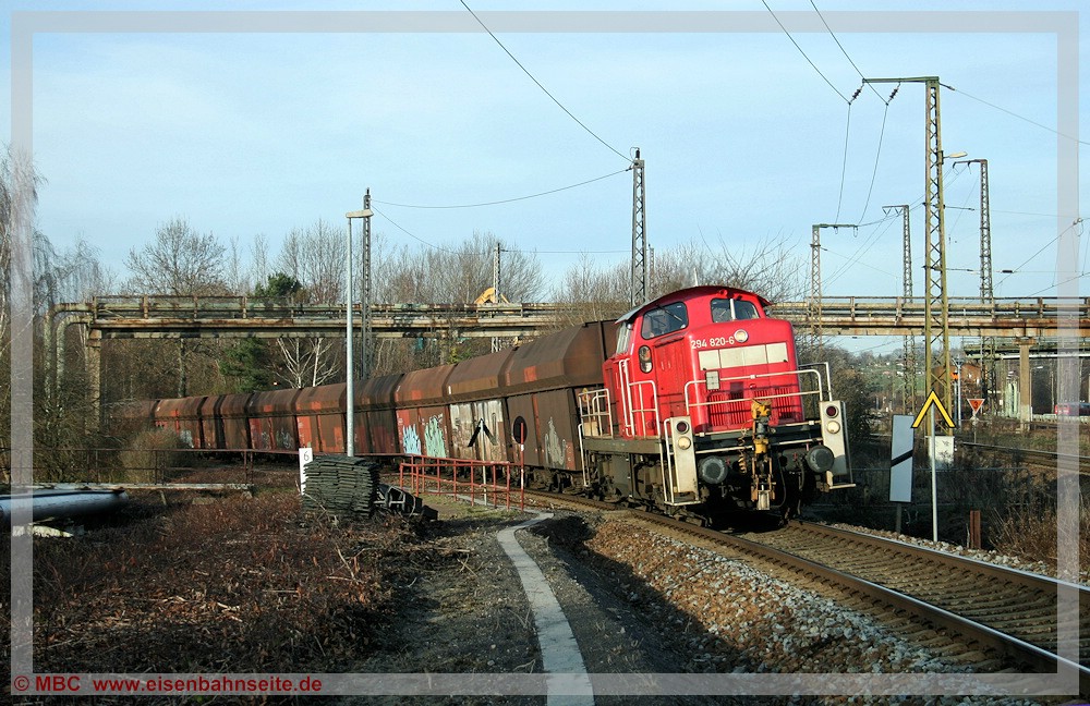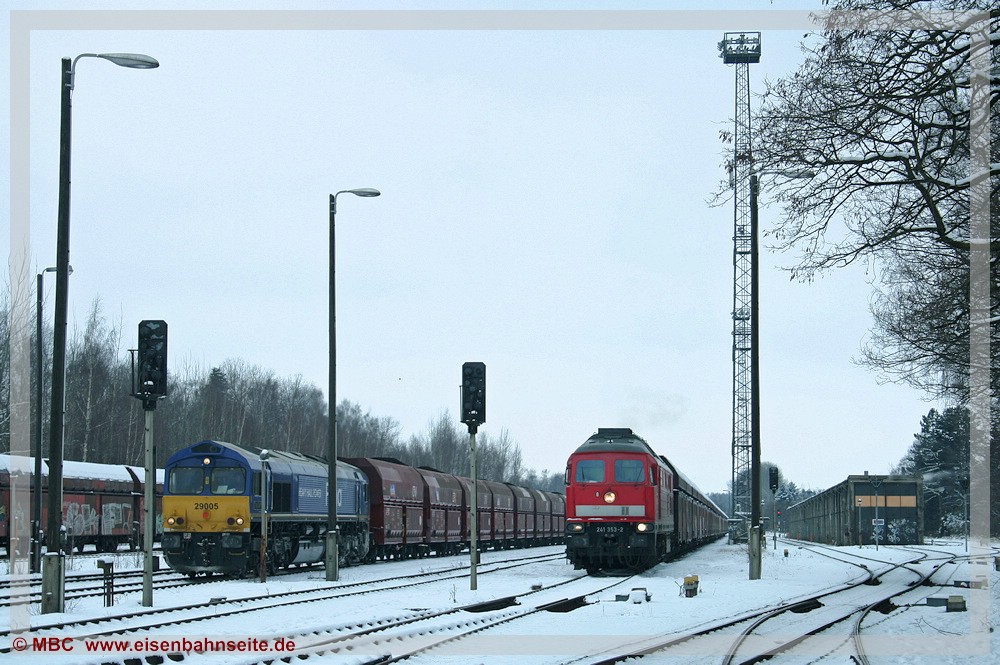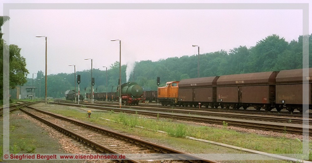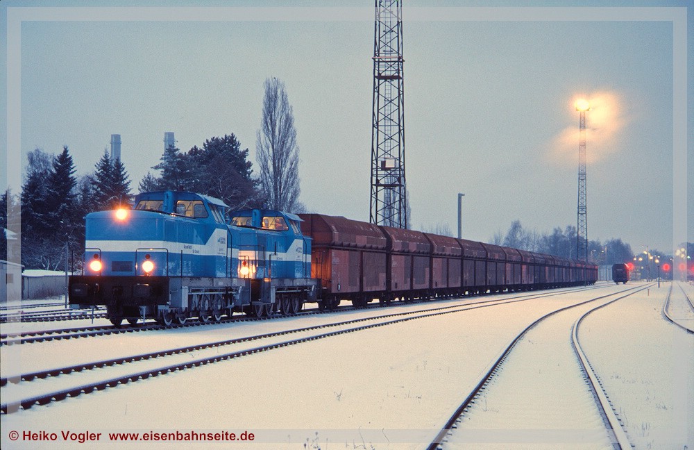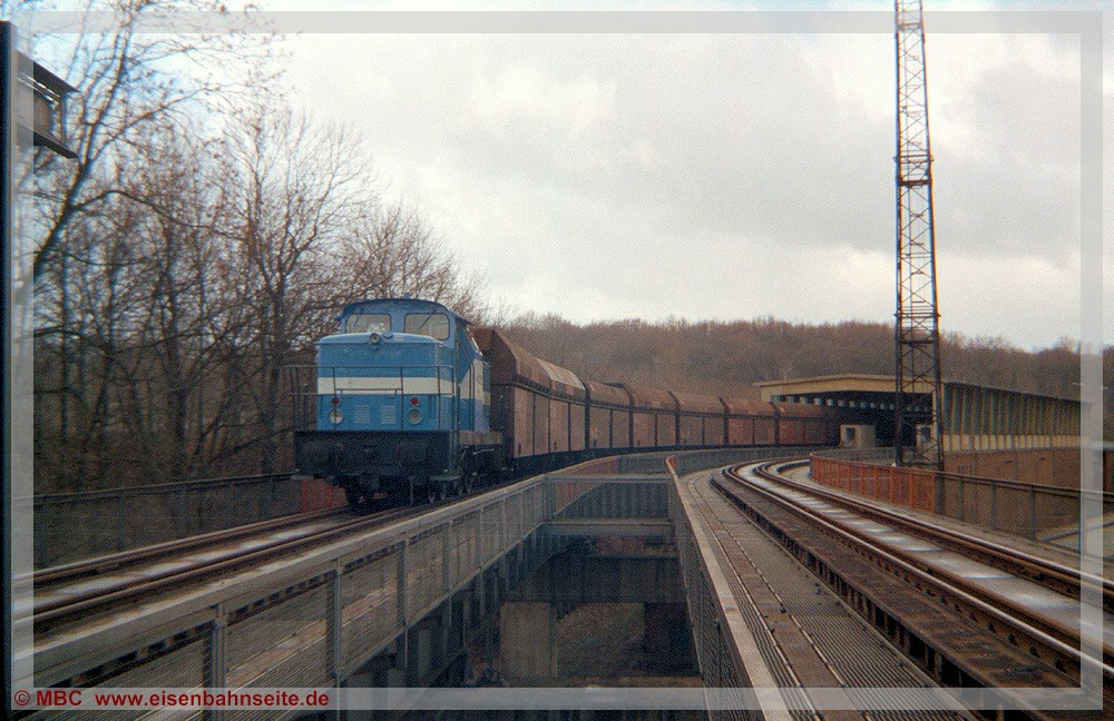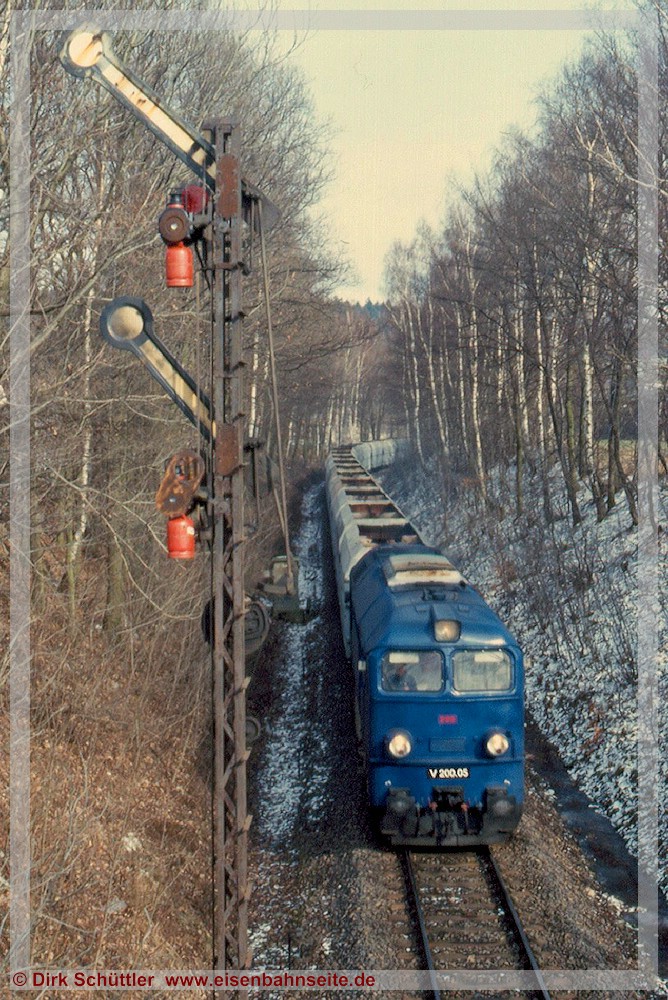 [55] Einer der von DB Cargo gefahrenen Testzüge aus Spreewitz. (Wobei ich nicht mehr sicher bin, ob es der Nachschuss auf einen Vollzug oder ein Leerzug war.) Die Aufnahme entstand in Chemnitz-Borna, wo die Industriebahn die KC-Linie überquerte. Die Spreewitzzüge waren 2000, neben der „Sandwich-Traktion“, daran zu erkennen, dass sie reinrassig aus Fals(-zz) 164 gebildet waren. Diese Vorgängerbauart der Falns 165 aus Arad stellte mit 1.150 beschafften Exemplaren ab 1977 die am weitesten verbreitete vierachsige Selbstentladewagenbauart der Deutschen Reichsbahn dar, blieb aber an „unserer“ Kohle die Ausnahme.[56] Zusätzlich zu den DB Cargo-Zügen kam auch ein Testzug mit Privatbahnfahrzeugen zwischen Spreewitz und Küchwald via Wüstenbrand zum Einsatz. Am 18. Februar 2000 erreichte V 200.05 der Prignitzer Eisenbahn GmbH mit einem Leerzug den Bahnhof Wüstenbrand.