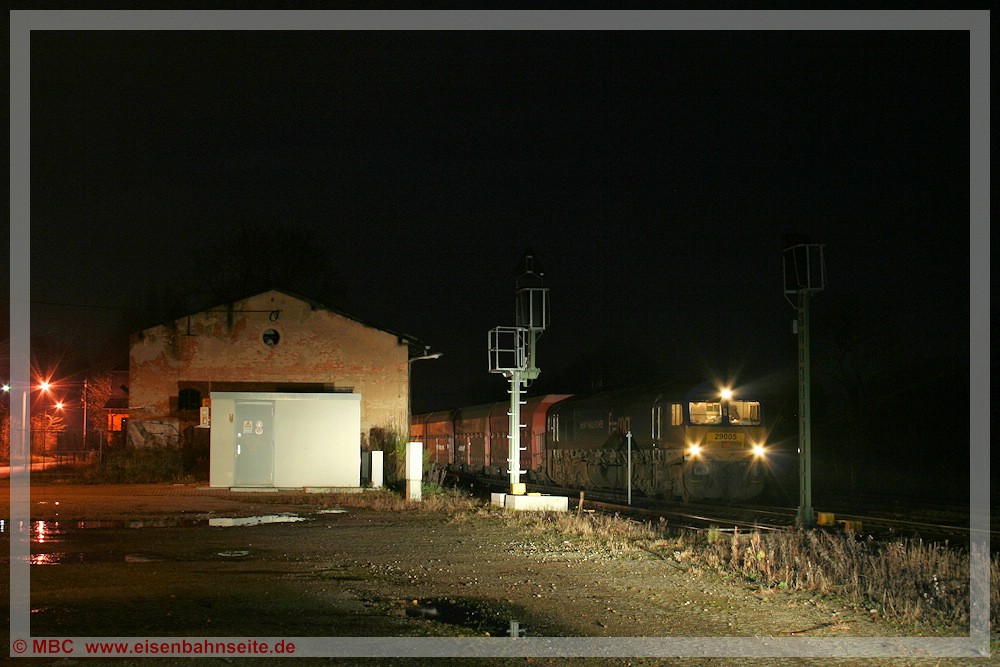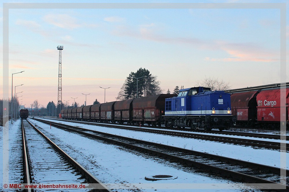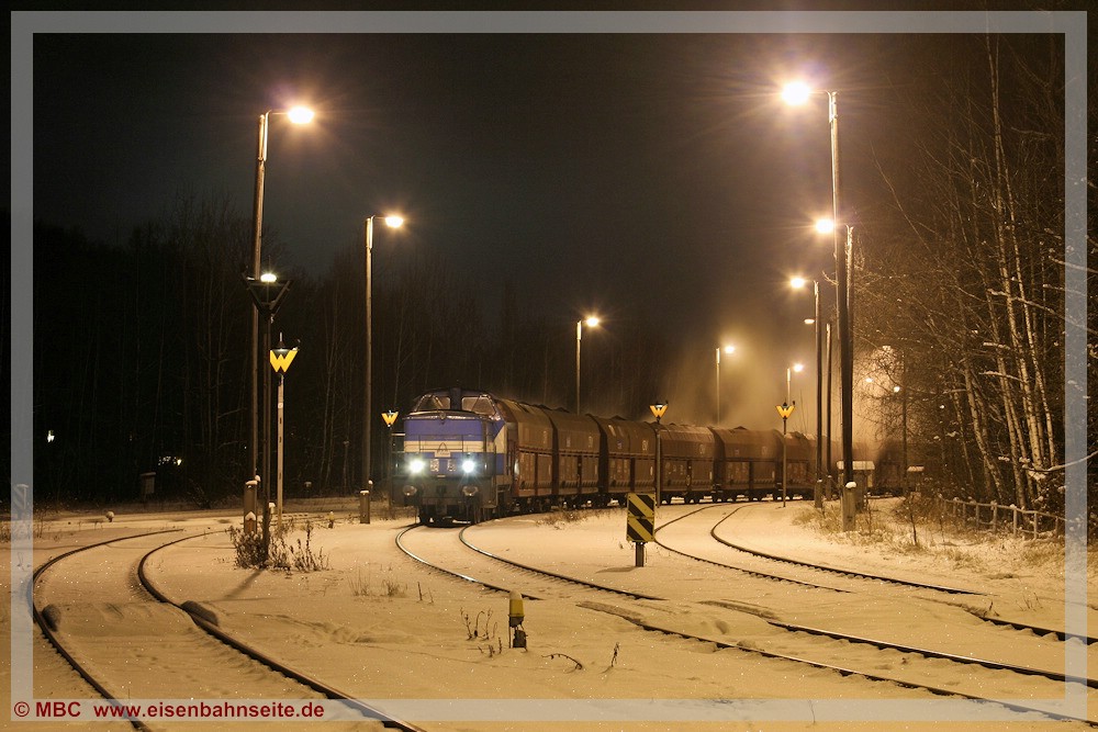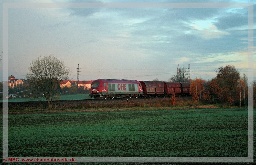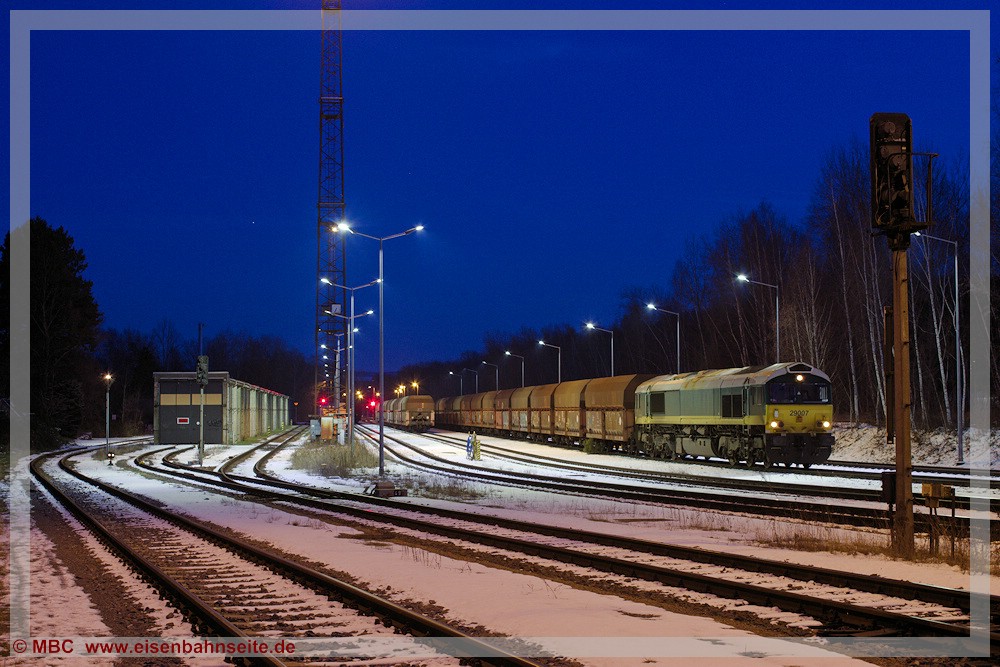 [72] Schichtwechsel! Während 266 029 am 7. Januar 2010 mit einem Vollzug eintrifft, wartet 241 353 darauf, den vorletzten Leerzug aus der DB-/Spreewitz-Ära in Richtung KC zu drücken. Links steht die letzte DB-Garnitur, die noch einen weiteren Tag auf die Abholung warten muss, siehe [71].[73] Selbst die Gleislängen des Bf Küchwald waren nicht ausreichend, um die 44-Wagen-Züge zu fassen. Die Schlusslok 266 027 des Leerzuges steht weit hinter den Ausfahrsignalen in Richtung Chemnitz-Hilbersdorf. Während die Züge voll über Gößnitz und Chemnitz Hbf verkehrten, fuhren Leerzüge im ersten Halbjahr 2010 über Geithain.[74] Die EMD-Lokomotiven der Baureihe JT42CWR alias Class 66 waren eine willkommene Abwechslung. Hier ist die noch im älteren, fotogeneren HHPI-Design gestaltete 29003/266 015 „Rhoda Painter“ mit einem Vollzug im Bf Küchwald zu sehen. Der überlange Zug war am Abend des 15. Februar 2010 soeben angekommen. Erst nachdem die V 60 D die ersten elf Wagen in Richtung Entladebunker abgezogen hatte, konnte 266 015 bis hinter das Ausfahrsignal nachrücken.[75] Die auch im Leerlauf recht geräuschvollen Class 66 sorgten bei den Anwohnern in Chemnitz-Furth für Unmut. Nachdem eine Nachtruhe erwirkt wurde, warteten die Kohlezüge ab November 2010 in Wittgensdorf oberer Bahnhof auf Einlass bis in die Morgenstunden. Am 19. November 2010 war 266 029 gerade mit der Kohle im oberen Bahnhof angekommen. Unterstützt wurde sie am Zugende von 223 103 der OHE.[76] 223 103 (OHE 270082) war im November 2010 leihweise als Schubunterstützung der Kohlezüge für HHPI im Einsatz. Für Fotos gab es nur wenig Tageslicht beim morgendlichen Leerzug, so wie hier am 10. November in Wittgensdorf.