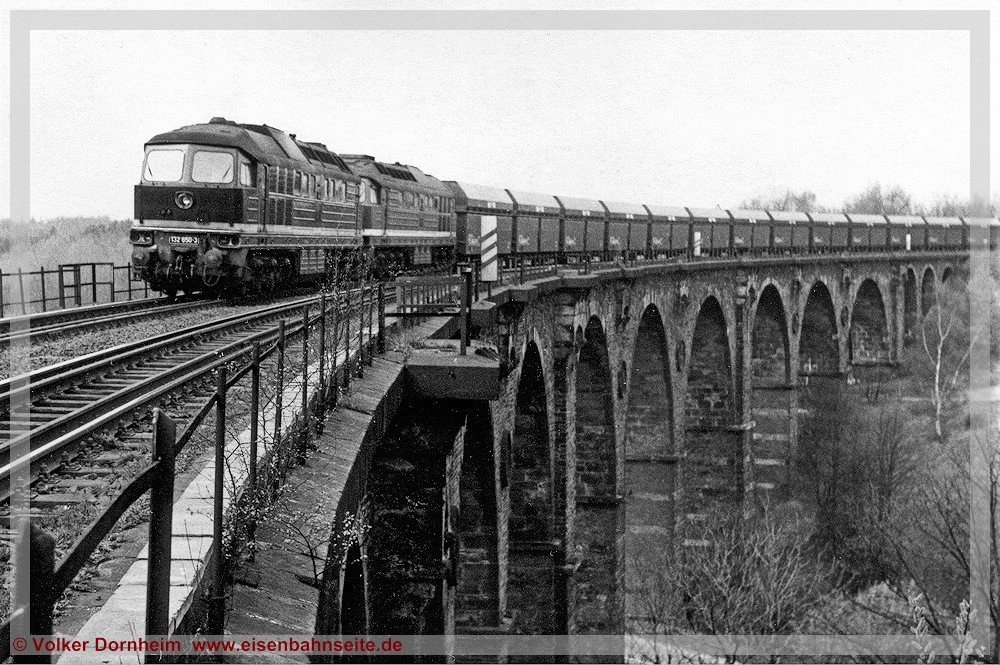 [46] Eine zweite Plandampfaktion betraf die Kohle am 14. September 2000. Anlässlich 100 Jahre Bw Hilbersdorf und 10 Jahre SEM war u. a. ein Kohlezug mit 50 3648 und 50 3501 bespannt. Am Zugschluss half 52 8075. Hier ist der dampflokgeführte KC 64247 auf dem Göhrener Viadukt über der Zwickauer Mulde zu sehen. Gut zu erkennen ist, dass die Sanierung des Viadukts noch nicht abgeschlossen ist. Es fehlt u. a. noch die Brüstung aus Natursteinen.[47] Der Horizontblick bei Wittgensdorf war eine interessante Stelle. Zwei 232 waren im November 2000 mit einem Leerzug nach Profen unterwegs. Links erkennt man den Vorsignalwiederholer der Blockstelle Wittgensdorf Mitte.[48] Am 18. Februar 2002 querte ein weiterer Kohlezug die Sandstraße in Chemnitz-Borna. Zuglok 232 031 sowie Schublok 232 298 tragen die orientrote Farbgebung mit Frontlatz. Unter den Selbstentladewagen gab es auch Exoten, hier an dritter Stelle ein Fals 166 mit 300 mm niedrigerem Oberkasten und an sechster Stelle eines der seltenen verkehrsroten Exemplare eines Falns 165.