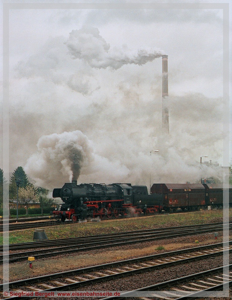 [34] 132 601 und 132 164 waren dem Zielbahnhof am 29. März 1986 schon sehr nahe als sie mit frischer Braunkohle den Haltepunkt Karl-Marx-Stadt-Borna hinter sich ließen. Im Hintergrund ersichtlich ist die Güterzugstrecke nach Wüstenbrand, welche die Kohlezüge Ende der 1990er-Jahre planmäßig nutzten.[35] Dieses momentan nicht genau datiertbare Foto entstand ca. 1983/84 und zeigt einen Leerzug auf der Geraden zwischen Küchwald und Karl-Marx-Stadt-Borna Hp. 132 079 hat eine bunt gemischte Leine Fal-Wagen am Haken. Die ersten drei Wagen gehören zur Gattung Fal-zz [6556] (bis 1971: OOt 47, 1972-1979: Fad [6770] und ab 1994: Fal 162). Hobby-Modelleisenbahner konnten in der DDR mit diesem Wagentyp auf ihren H0- und TT-Anlagen Kohlezüge nachbilden, denn diese ab 1962 von Waggonbau Niesky und Waggonbau Gotha beschafften Drehgestell-Schüttgutwagen gehörten zum Miniatursortiment der nationalen Hersteller.[36] Leider nur in mäßiger Qualität liegt diese Aufnahme vor, allerdings ist sie ein sehr rares Zeitdokument: Der Blick vom alten Befehlstellwerk 1 des Bf Küchwald auf einen aus Richtung Geithain einfahrenden Kohlezug. Den Beheimatungsdaten der Zuglok 120 269 zufolge ist die Aufnahme höchstwahrscheinlich im Zeitraum 1970 bis 1973 entstanden. Rechts ist ein Weichensignal zu erkennen, das verrät, dass die Industriebahn (Küchwald – Wüstenbrand) noch über eine doppelte Kreuzungsweiche angebunden war. Den Spurplan vereinfachte man Ende der 1980er-Jahre an dieser Stelle. Die Freifläche im Hintergrund war noch nicht als Formsanddeponie der Stahlgießerei verwendet worden, sodass man den Trassenverlauf der Industriebahn gut einsehen konnte. Der Zug bestand überwiegend aus Fad [6772], den späteren Fal(-zz) [6553, 6555]. Die „Taigatrommel“ 120 269 begann ihr Betriebsleben am 12. Juli 1969 im Bw Karl-Marx-Stadt und ist heute im früheren Betriebsteil Hilbersdorf (heute SEM) als Museumsexponat erhalten geblieben. (EVS, 1991)[37] 1987/88 beschaffte die Deutsche Reichsbahn 460 Selbstentladewagen von der rumänischen Waggonfabrik UV Arad. Sie erhielten zunächst die Bezeichnung Falns [6636], ab 1994 als Falns(-x) 165 bezeichnet. Im April 1989 hatte sich diese Gattung bereits fest etabliert, als Volker Dornheim einen Vollzug auf dem Bahrebachviadukt erwischte. [38] Anfang der 1990er-Jahre kamen V 200 des Bw Altenburg vor den Kohleganzzügen bis nach Chemnitz zum Einsatz. Die Aufnahme vom 15. September 1991 zeigt 120 137 und 120 164 – beide Bw Altenburg – vor einem Kohlezug bei der Durchfahrt im Bahnhof Frauendorf (Sachs). Im Gegensatz zur vorhergehenden Abbildung besteht der Zug wieder aus älteren Fal-Wagen.[39] Für die als „Wumme“ oder „Taigatrommel“ in die Eisenbahngeschichte eingegangene DR-Baureihe V 200 (ab 1970: BR 120, ab 1992: BR 220) wurde das Jahr 1 der DB AG das Finale in Diensten einer deutschen Staatsbahn. Zum Sommerfahrplanwechsel’94 schieden die 220 des Bw Leipzig-Wahren aus dem Plandienst aus. Zum Abschied ließ man die drei optisch gepflegtesten Exemplare am 28. Mai 1994 noch einmal vor der Kohle nach Küchwald ihre Stärke zeigen. Im Bahnhof Cossen waren 220 295, 220 288 und die seit Borna schiebende 220 353 mit Gag 56565 von Zwenkau nach Küchwald unterwegs.[40] Am Morgen des 27. März 1997 holten 232 122 und 232 558 den letzten Kohlezug im Übergabebahnhof Zwenkau ab. Fortan wurde die Kohle für Chemnitz aus dem Tagebau Profen bezogen. Rechts im Hintergrund erkennbar ist ein Kühlturm des neuen Kraftwerks Lippendorf, das 1999 in Betrieb ging.[41] Die ersten Kohlezüge in den 1960er-Jahren waren mit Dampflokomotiven bespannt. Nachgewiesen ist die Doppelbespannung mit BR 50 auch noch in den frühen 1970er-Jahren. Mehrmals fand sogenannter „Plandampf“ in Verbindung mit dem Küchwald-Kohlependel statt. Ende April 1997 ließ der VSE nach zähen Verhandlungen mit den Deutsche Bahn AG-Geschäftsbereichen Fernverkehr*, Traktion und Cargo die rund 2400 Tonnen schweren Kohlezüge für drei Tage mit Dampfloks traktionieren. Zum Einsatz kamen 52 8154 und abschnittsweise 58 3047. Bei regnerischem Aprilwetter verließ 52 8154 mit dem rund 800 Tonnen schweren Leerzug GDg 60564 den Küchwaldbahnhof nach Profen. Eine V 60 D der Stadtwerke leistete ungekuppelt Schubhilfe für die ersten Meter in Richtung Chemnitz-Borna. (*Dem GB Fernverkehr unterstanden die betriebsfähigen Dampfloks der DB AG, wozu die beim Plandampf eingesetzten 58 3047 und 86 1001 zählten.)