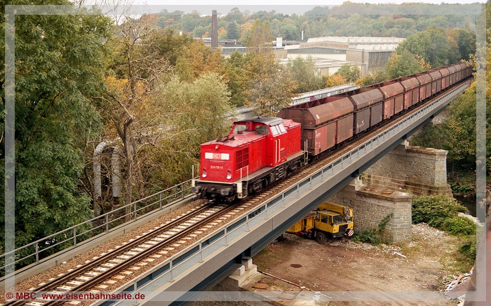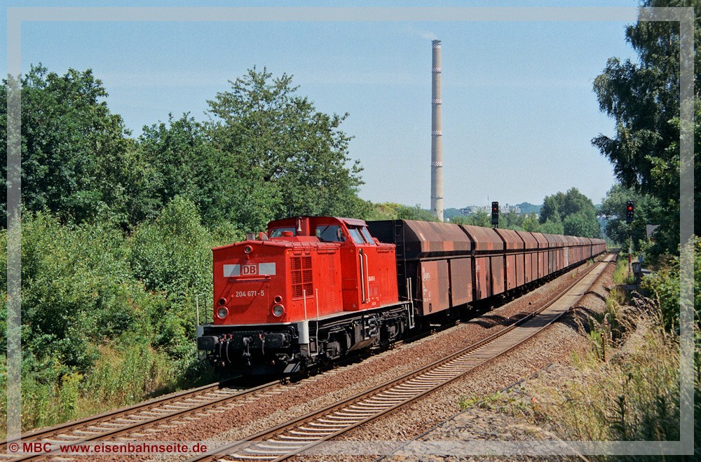 [49] Aus der Esse säußelte nur sehr verhalten etwas Dampf an diesem warmen 9. Juli 2002. 204 671 vorn und 204 641 am anderen Ende bringen einen Leerzug von Küchwald nach Chemnitz Hbf. In wenigen Metern erfolgt der Fahrtrichtungswechsel.[50] Auch im Oktober 2002 übernahmen 204 sämtliche Ganzzüge zwischen Küchwald und Chemnitz Hbf. Ein Leerzug mit 204 761 an der Spitze und 204 592 am Zugende querte die Chemnitz in Furth. Das 1999 nur halbherzig sanierte Brückenbauwerk war der Grund für den Einsatz der Baureihe 204 anstatt der 232.
