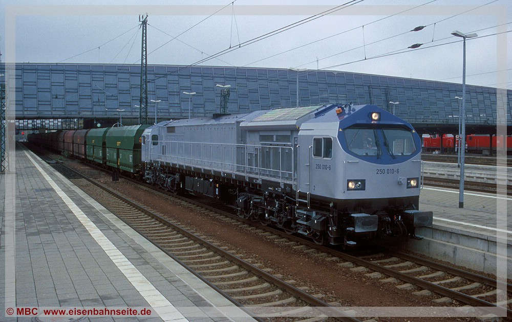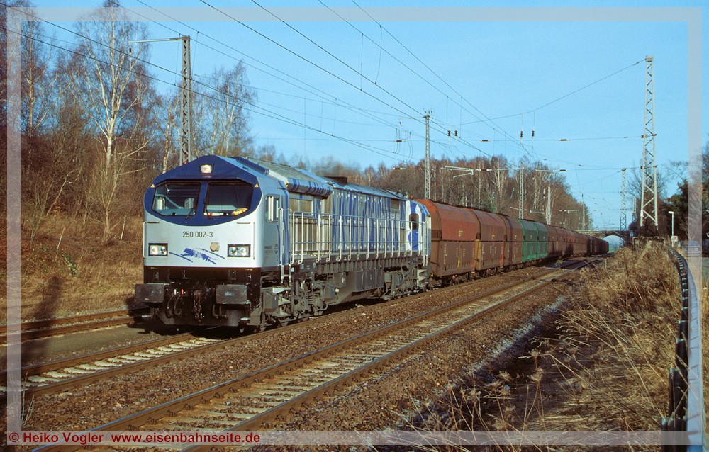 [57] Am 8. November 2004 hatte 250 010 mit einem Vollzug in Chemnitz Hbf bereits Kopf gemacht und steht in Richtung Küchwald abfahrbereit.[58] Bei schöneren Wetterverhältnissen erwischte Heiko Vogler die Probezüge aus Spreewitz auf der Strecke Riesa – Chemnitz. So auch am 10. Dezember 2004 in Oberlichtenau als der „Blue Tiger“ 250 002 mit 80387 nach Küchwald unterwegs war.