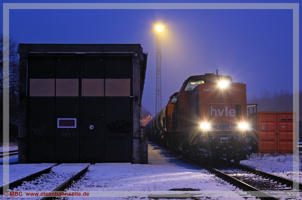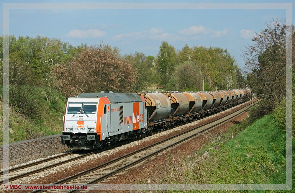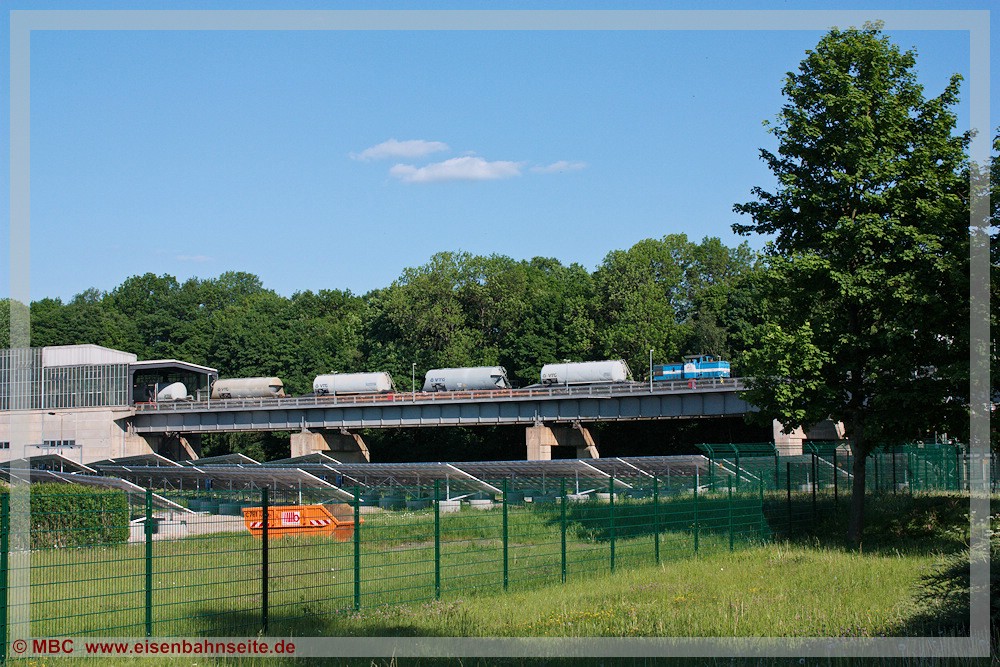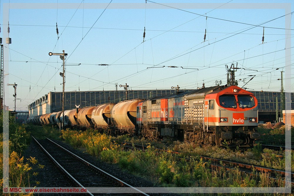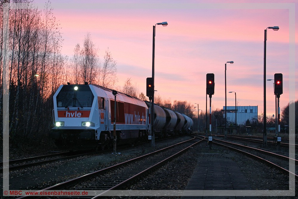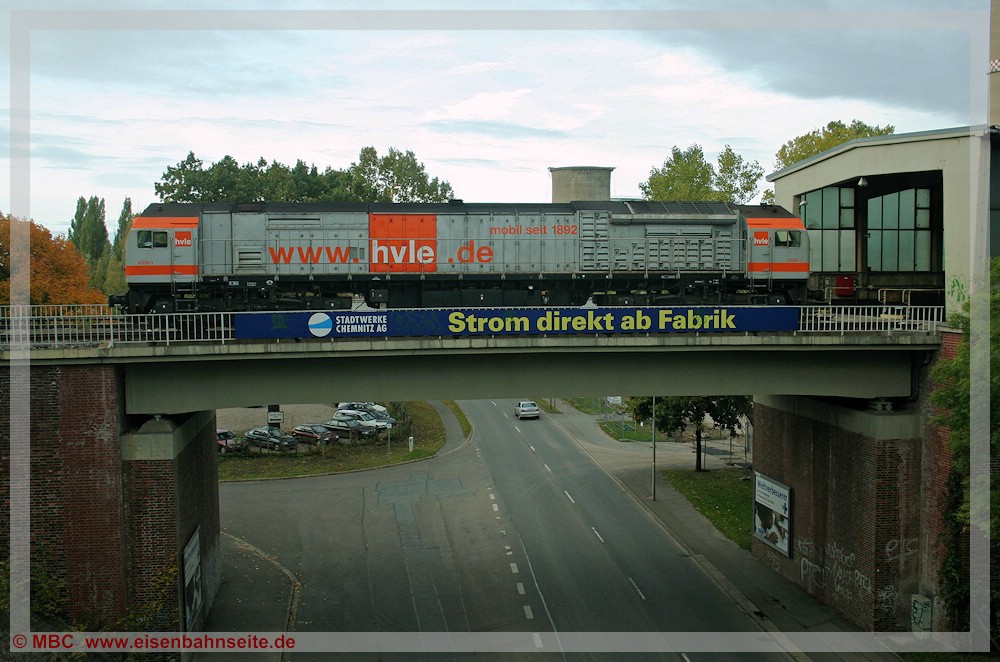 [109] Zwei 203 der OHE warteten im Mai 2005 mit einem Leerzug in Küchwald auf die Abfahrt.[110] Am 10. Juni 2005 waren in Chemnitz-Furth die V 100 mit der OHE-Bezeichnung V 130.1 (ex- DB 212 296, MaK 1000343) und V 130.2 (ex-DB 212 037, MaK 1000173) mit dem Leerzug zwischen Küchwald und Chemnitz Hbf unterwegs. Auf die in dem Moment aufbrechende Wolkendecke hätte der Fotograf gerne verzichtet.[111] Recht bald übernahm die Baureihe 250 die Hoheit über die Kalkzüge. Am 8. September 2005 war der Leerzug wieder über Chemnitz Hbf und Glauchau zum Zielort unterwegs, aufgenommen auf der Beckerbrücke, die bis 1946 vier Gleise trug. Nach der 2020 bis 2024 erfolgten Brückensanierung befinden sich die beiden verbliebenen Gleise mittig auf der Brücke.[112] 250 004 zog am 22. April 2007 den relativ kurzen Leerzug nach Blankenburg (Harz) durch den Haltepunkt Wittgensdorf Mitte. Wie zu erkennen ist, befand sich die „V 20“ damals noch im Eigentum der Mindener Kreisbahnen GmbH und wurde von der hvle angemietet. Mitte 2010 ging die Lokomotive dann in den festen hvle-Bestand über.[113] Noch modernere Traktion tauchte ab 2008 an der Zugspitze auf: Die neue Baureihe 285 (Traxx F140 DE) bespannte in Form von 285 001 nun regelmäßig das Küchwald-Kalkzugpaar. Das Foto zeigt den Leerzug am 27. April 2008 in Wittgensdorf Mitte.[114] Die hvle war auch eines der ersten EVU, das die Voith Maxima 40 CC einsetzte – die mit einer Traktionsleistung von 2850 kW bis dato weltweit stärkste einmotorige sechsachsige dieselhydraulische Lokomotive. Während des Herausdrückens aus dem Bf Küchwald legte der Leerzug am Wartezeichen einen längeren (Kaffee?-)Halt ein, sodass diese Dämmerungsaufnahme von 264 004 in Höhe der Ausfahrsignale am 22. November 2009 entstehen konnte.[115] Am Sonntagmorgen des 5. September 2010 erhellte der Stern erst seit wenigen Sekunden die Szenerie des aus Richtung Glauchau in Chemnitz Hbf eingefahrenen Kalkzuges. Die mit 250 002 bespannte Fuhre muss einen Betriebshalt einlegen. Gut zu erkennen ist, dass man die Gleisanlage vor dem großen Bahnhofsum- und rückbau der Renaturierung preisgegeben hat.