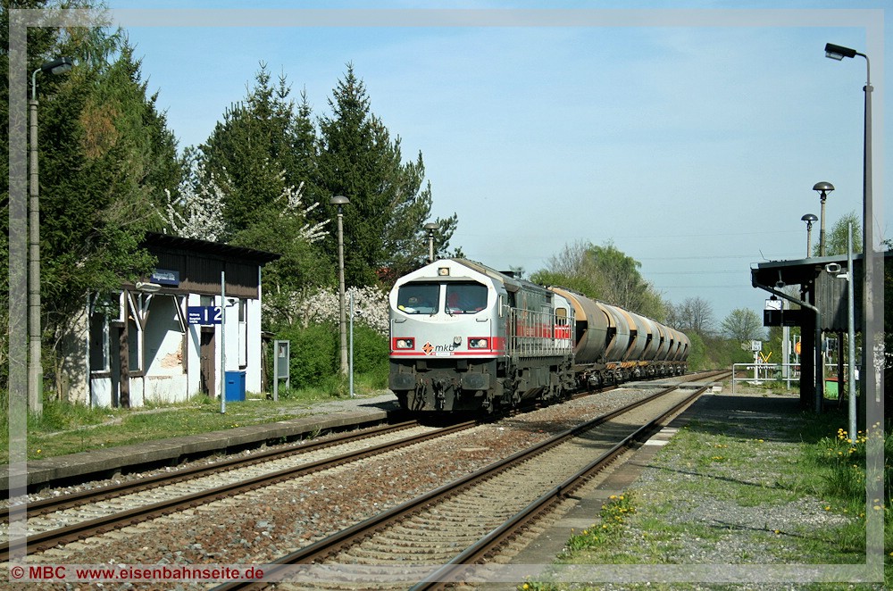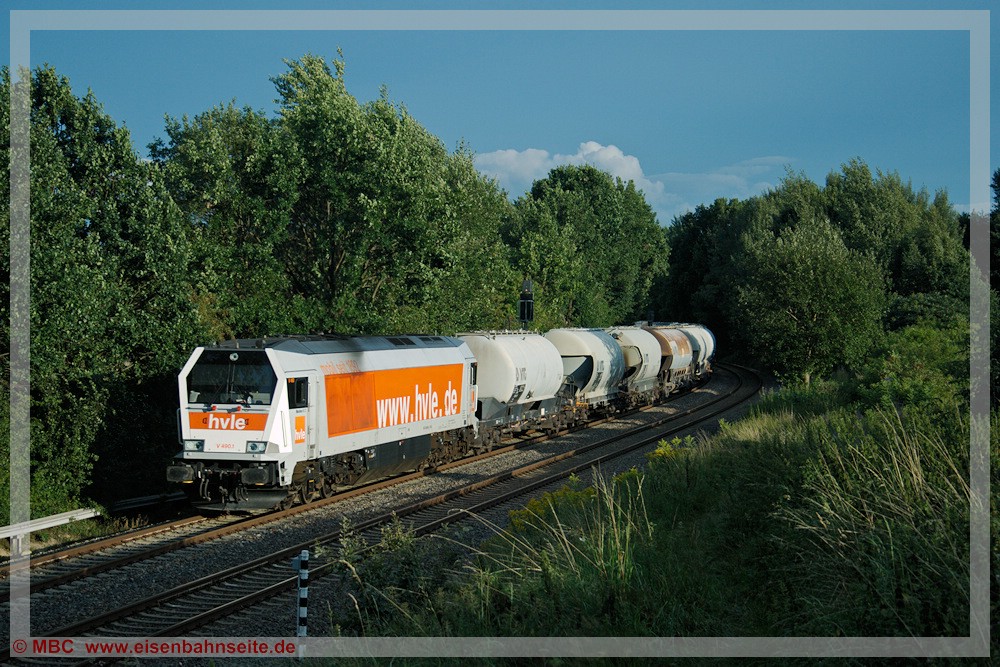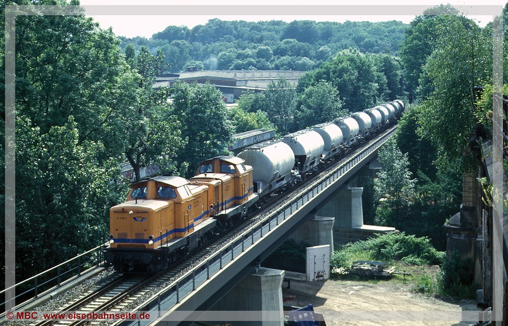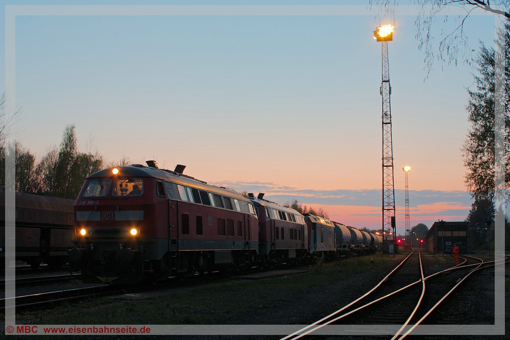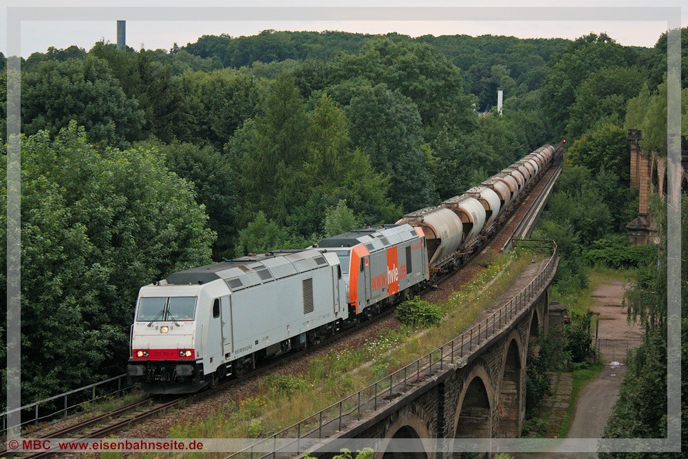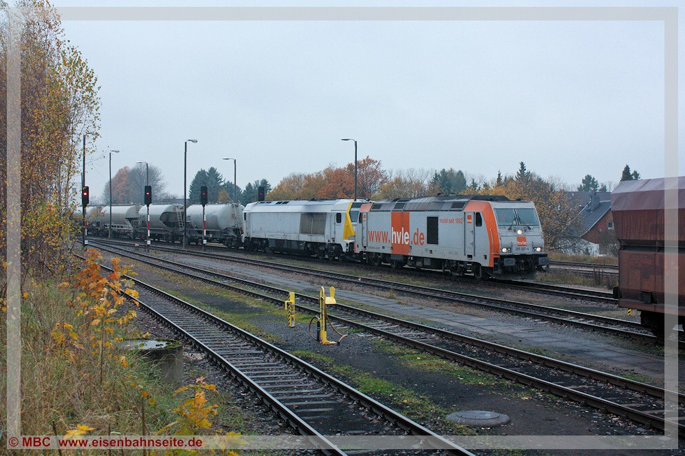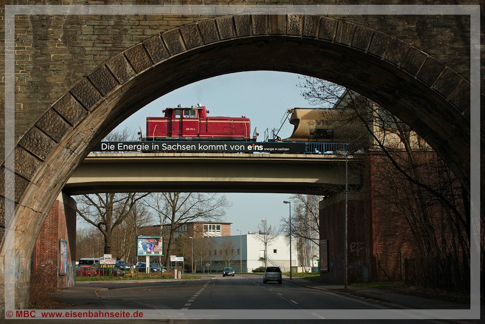[109] Zwei 203 der OHE warteten im Mai 2005 mit einem Leerzug in Küchwald auf die Abfahrt.[110] Am 10. Juni 2005 waren in Chemnitz-Furth die V 100 mit der OHE-Bezeichnung V 130.1 (ex- DB 212 296, MaK 1000343) und V 130.2 (ex-DB 212 037, MaK 1000173) mit dem Leerzug zwischen Küchwald und Chemnitz Hbf unterwegs. Auf die in dem Moment aufbrechende Wolkendecke hätte der Fotograf gerne verzichtet.[111] Recht bald übernahm die Baureihe 250 die Hoheit über die Kalkzüge. Am 8. September 2005 war der Leerzug wieder über Chemnitz Hbf und Glauchau zum Zielort unterwegs, aufgenommen auf der Beckerbrücke, die bis 1946 vier Gleise trug. Nach der 2020 bis 2024 erfolgten Brückensanierung befinden sich die beiden verbliebenen Gleise mittig auf der Brücke.[112] 250 004 zog am 22. April 2007 den relativ kurzen Leerzug nach Blankenburg (Harz) durch den Haltepunkt Wittgensdorf Mitte. Wie zu erkennen ist, befand sich die „V 20“ damals noch im Eigentum der Mindener Kreisbahnen GmbH und wurde von der hvle angemietet. Mitte 2010 ging die Lokomotive dann in den festen hvle-Bestand über.[113] Noch modernere Traktion tauchte ab 2008 an der Zugspitze auf: Die neue Baureihe 285 (Traxx F140 DE) bespannte in Form von 285 001 nun regelmäßig das Küchwald-Kalkzugpaar. Das Foto zeigt den Leerzug am 27. April 2008 in Wittgensdorf Mitte.[114] Die hvle war auch eines der ersten EVU, das die Voith Maxima 40 CC einsetzte – die mit einer Traktionsleistung von 2850 kW bis dato weltweit stärkste einmotorige sechsachsige dieselhydraulische Lokomotive. Während des Herausdrückens aus dem Bf Küchwald legte der Leerzug am Wartezeichen einen längeren (Kaffee?-)Halt ein, sodass diese Dämmerungsaufnahme von 264 004 in Höhe der Ausfahrsignale am 22. November 2009 entstehen konnte.[115] Am Sonntagmorgen des 5. September 2010 erhellte der Stern erst seit wenigen Sekunden die Szenerie des aus Richtung Glauchau in Chemnitz Hbf eingefahrenen Kalkzuges. Die mit 250 002 bespannte Fuhre muss einen Betriebshalt einlegen. Gut zu erkennen ist, dass man die Gleisanlage vor dem großen Bahnhofsum- und rückbau der Renaturierung preisgegeben hat.