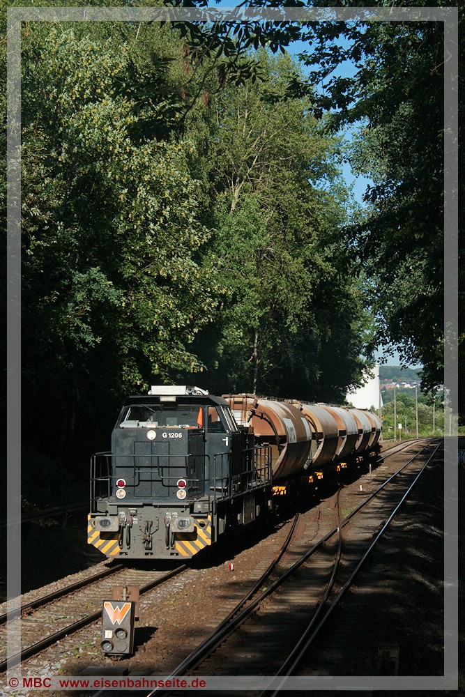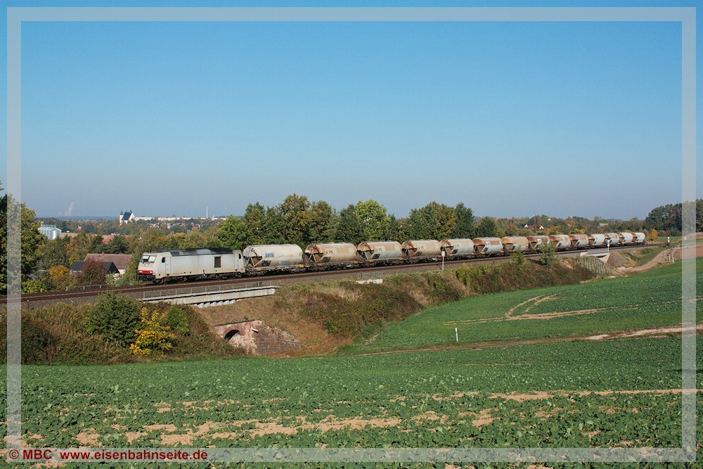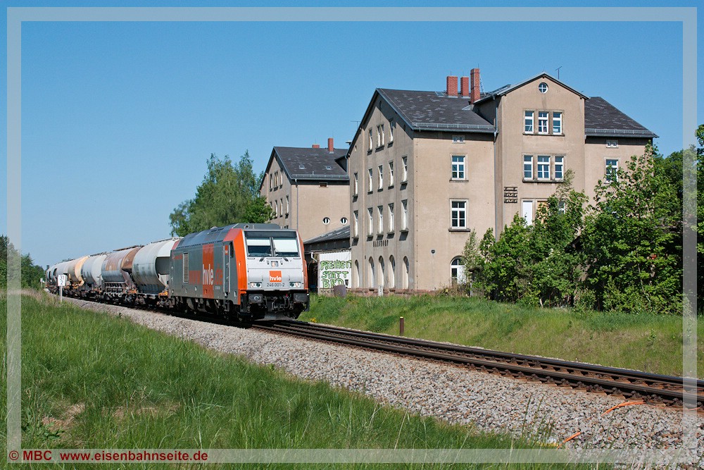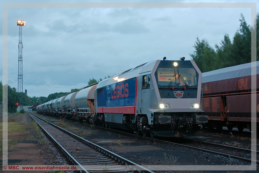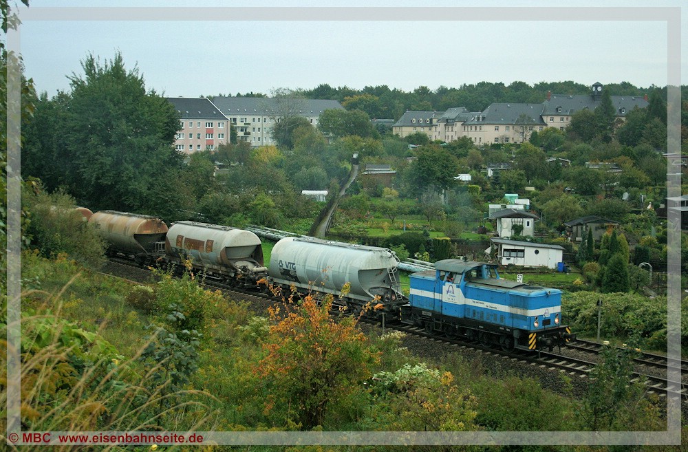 [116] Völlig renaturiert ist mittlerweile dieser Standpunkt von einer Bornaer Abraumhalde auf die am 26. September 2010 aus Küchwald ausfahrende Rangierfahrt mit AHG-Lok Nr. 3 (LEW 16530). Dieses Prozedere kennen wir schon aus Teil 2 [96] mit in Richtung Chemnitz Hbf verkehrenden Leer-Kohlezügen. Im Gegensatz dazu ist die V 60 D aber in diesem Fall ziehend aktiv, wie man an der Abgasfahne erkennt. [117] Am Sonntagabend des 7. August 2011 passierte 264 004 mit dem Leerzug soeben das südliche Einfahrsignal von Wittgensdorf oberer Bahnhof, das die Bahnhofsgrenze markiert.[118] Ein weiterer Spross der Traxx-Familie und damit wieder eine neue Baureihe am Kalk: Seit Dezember 2011 besitzt die hvle zwei Traxx P160 DE, die in Deutschland als Baureihe 246 eingegliedert sind. Von dieser eigentlich für den Personenverkehr entwickelten dieselelektrischen Variante sind 2006/07 lediglich elf Exemplare (2200 kW) gefertigt worden. 246 001 zog am 24. Mai 2012 den Vollzug durch die Überleitstelle auf dem Terrain des ehemaligen Bf Narsdorf.