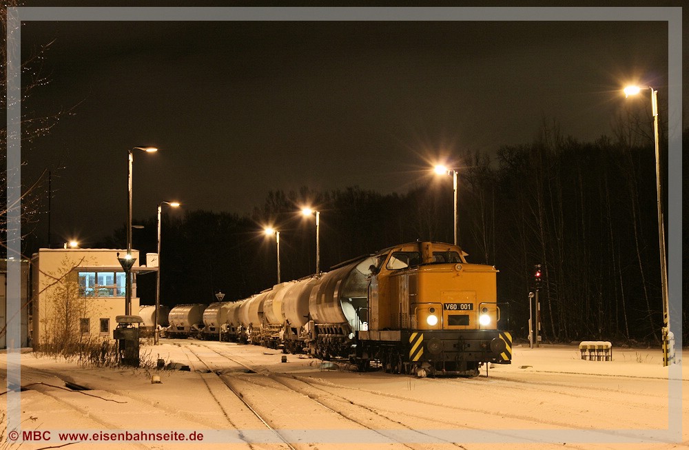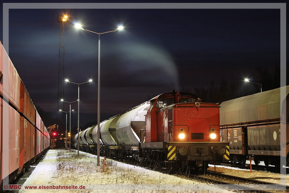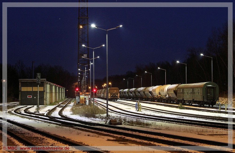 [128] Nicht schön, aber markant präsentiert sich das 1991 in Betrieb genommene Befehlstellwerk 1 des Bf Küchwald. Am 16. Oktober 2001 rangierte SWC 1 (LEW 17695) vier zweiachsige Silowagen an die Spitze eines Leerzuges. Es handelte sich um drei Exemplare der Bundesbahn-Bauart Ucs 909 und einen Ucs 908. Die Entleerung erfolgte mittels Druckluft.[129] Der gleiche Rangiervorgang, nur mit anderen Fahrzeugen: Am 29. Januar 2002 bewegte SWC 3 (LEW 16530) drei Uacns 947“ im Nordkopf des Küchwaldbahnhofs. Auf dem gleisfreien Terrain in Bildmitte befand sich bis 1991 das originale Befehlstellwerk 1.[130] Am 5. Oktober 2008 bestätigte sich die Regel als 250 002 (hvle-Bezeichnung V 330.1) den Leerzug selbst aus dem Anschluss abholte und hierfür die Schönherrstraße überquerte. Der Grund dafür kann nicht mehr ermittelt werden, denn Werklok 3 hätte zur Verfügung gestanden. In Höhe des rechten Führerstandes sichern seit September 2024 Prellböcke die neuen Gleisenden.[131] Immer wieder sonntags: AHG 1 (LEW 17695) zieht den fertig entladenen Zug am Nachmittag des 17. Januar 2010 langsam zurück an die Ausfahrgruppe. Ungewöhnlich ist jedoch, dass sich 263 001 zu diesem Zeitpunkt schon aufgerüstet zeigt. Sie wird den Zug nach Blankenburg (Harz) ziehen.[132] War die erste Zughälfte entladen, teilte man den Zug. Die hintere, entladene Hälfte wurde abgestellt und den vorderen Zugteil drückte man wieder in die Entladung. Wurden die sonntäglichen Kalkzüge im Regelfall tagsüber entladen, gab es ab 2010 in den Wintermonaten bedarfsweise einen zweiten Zug, der Donnerstagnachmittag ankam und bis in die Nacht entladen wurde. Da die Zugteilung zirka zwei Minuten dauerte, konnte dies für Langzeitbelichtungen genutzt werden. Der Grund für den gestiegenen Kalkbedarf war die (Rück-)Umstellung auf Braunkohle aus dem Profener Tagebau zum Jahreswechsel 2009/10 (vgl. Teil 2). Die Rangierlok ist hier die 2010 vom LDC angemietete LEW 12362.[133] Konnte man von der Blankenburgstraße aus diesen „herausragenden“ Anblick erleben, bedeutete das, dass noch der erste Zugteil entladen wird. Bevor die sichtbaren Wagen in den Bunker gelangen können, muss der Rest ausrangiert werden. (24.05.2012)[134] Der Gewölbebogen der KCCh-Linie bildet den Rahmen für 260 312, die gerade entladene Wagen über die Schönherrstraße zieht. Rangierfahrten über diese Brücke gehörten jahrzehntelang zum Stadtbild und fanden 2024 ein jähes Ende. (03.04.2016)[135] Dieselbe Stelle und Situation wie im vorigen Foto aus anderer Perspektive mit anderer Lokomotive. AHG 5 (LEW 15615) hat am 25. April 2019 die Rangieraufgabe übernommen. Der soeben durchfahrene Entladebunker des HKW I ist seit April 1997 funktionslos.[136] Diese Aufnahme belegt, dass der Kalkzug ab und an für Wagenüberführungen mitgenutzt wurde. Ein Bmh der Rennsteigbahn wurde am 22. Januar 2023 mit dem Kalkzug nach Chemnitz Küchwald überführt, um einen Sonderzug zu verstärken. Hier sehen wir ihn vor der Rückreise am Leerzug des 9. Februar 2023. Später versperrten leider entladene Kohlewagen die Sicht auf den Pseudo-Gmp.[137] Zwischen Gips und Kohle hat sich am Morgen des 29. Januar 2023 AHG 5 an den vor wenigen Minuten eingetroffenen Kalkzug gesetzt, um ihn gleich zur Entladung zu schieben.