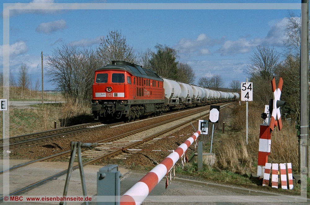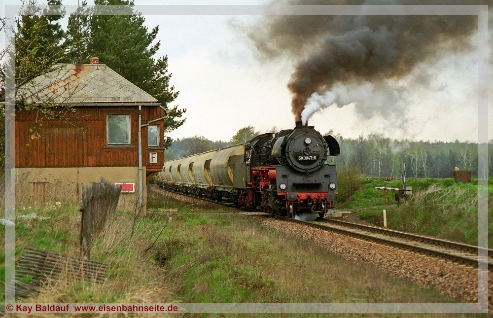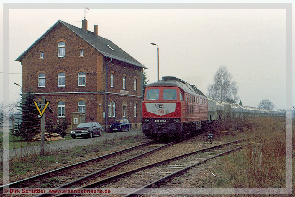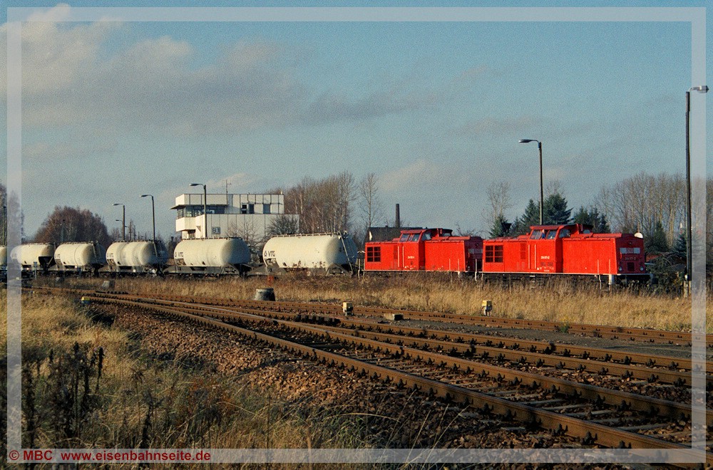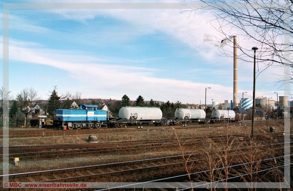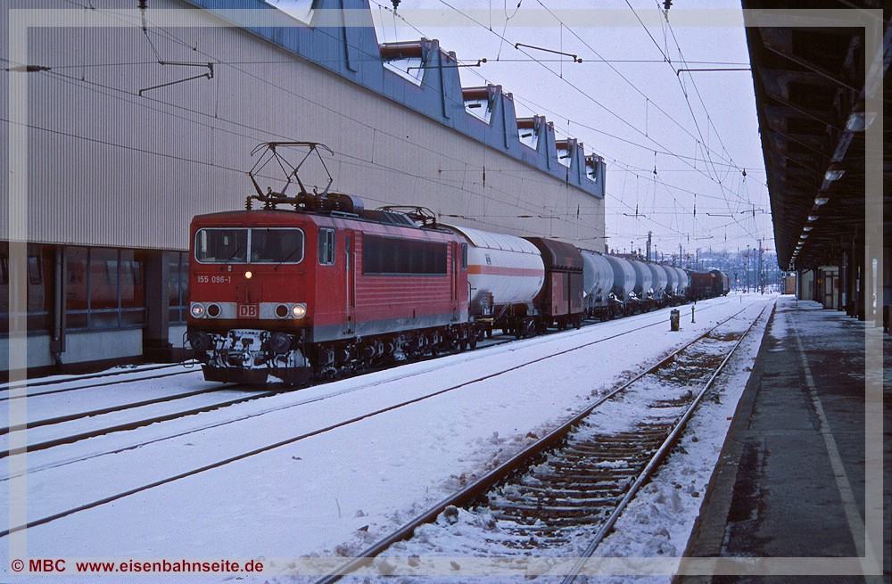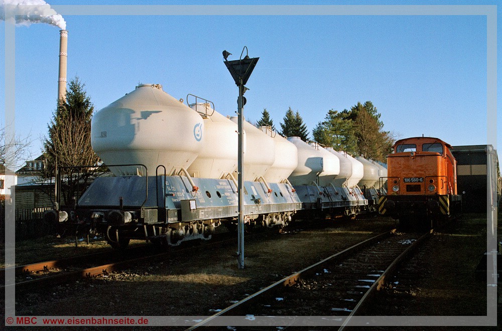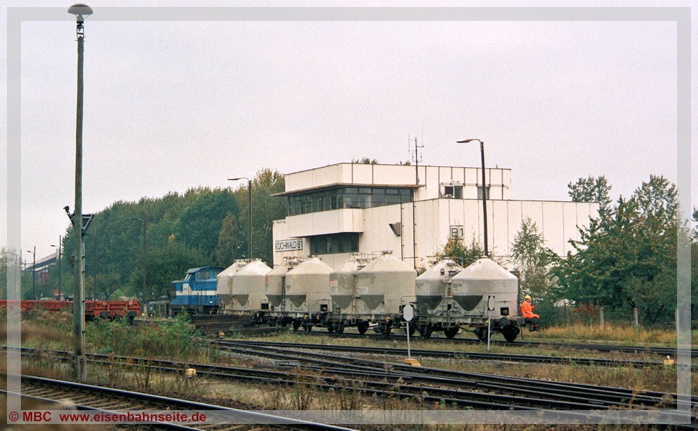 [102] Da die Kalkzüge erst seit 1996 nach Chemnitz verkehrten, waren sie nie mit einer Dampflokomotive bespannt? Doch! Am 28. April 1997 war im Rahmen einer Plandampfveranstaltung (siehe [41] in Teil 2) auch der Kalkzug Teil des Programms. 58 3047 zog den Dg 74310 ab Engelsdorf über Bad Lausick bis Küchwald*. Ab Narsdorf unterstützte 86 1001 als Schubhilfe tatkräftig die Dreizylindermaschine bei der Bergfahrt gen Wittgensdorf. Hier sehen wir die Fuhre in der Steigung zwischen Cossen und Burgstädt am Schrankenposten Heiersdorf (vormals Blockstelle). *In Geithain hatte der Kalkzug an diesem Tag planmäßig rund dreieinhalb Stunden Aufenthalt, denn 58 3047 leistete von Geithain bis Wittgensdorf ob Bf in der Zwischenzeit der Kohle Vorspanndienst. Bis Geithain hatte 232 122 den Kohlezug von Profen über Groitzsch nachgeschoben.[103] 232 679 zog am 30. März 1999 einen Ganzzug mit zweiachsigen Silowagen (Ucs) durch den früheren oberen Bahnhof von Grüna in Richtung Küchwald. Ob es sich um einen Kalkzug handelte, oder die Wagen in diesem Fall leer waren und zur Ascheabfuhr des HKW genutzt worden sind, lässt sich nicht zweifelsfrei behaupten. Im zweiten Falle wäre das Bild im geplanten 5. Teil dieser Reihe (Gips und Asche) besser aufgehoben.[104] Ab 2002 waren Wagen der Bauart Uacns 947“ für einige Jahre vorherrschend im Kalktransport nach Küchwald. Die Baureihe 204 kam hingegen nur kurzzeitig zwischen Chemnitz Hbf und Küchwald planmäßig vor diesem Zug zum Einsatz. Am 20. November 2002 schoben 204 671 und 204 592 den Leerzug aus Küchwald am Befehlstellwerk 1 vorbei.[105] Eher eine Ausnahmeerscheinung waren die tschechischen Uacs 451 im Küchwaldbahnhof. Am 18./19. Dezember 2003 weilte ein Ganzzug bestehend aus den „Zwiebelquartetts“ in Küchwald. Mitte der 1990er-Jahre kamen diese auch im Aschetransport über Chemnitz-Glösa zum Einsatz.[106] Der sonntägliche Leerzug Küchwald – Blankenburg (Harz) war am 21. März 2004 mit Zuglok 232 674 am Block Wittgensdorf Mitte unterwegs. Der Blockwärter bediente auch die Vollschranke Chemnitzer Straße.[107] Am 9. Januar 2005 fuhr der letzte Ganzzug unter DB-Regie. 232 543 querte mit dem Leerzug die Zwickauer Mulde bei Göhren.[108] Im ersten Quartal 2005 gewährleistete man die Kalktransporte im Einzelwagenverkehr. 155 096 steht mit der Übergabe von Chemnitz Süd nach Zwickau im Chemnitzer Hbf abfahrbereit. Gut erkennbar sind die sechs Kalkwagen.