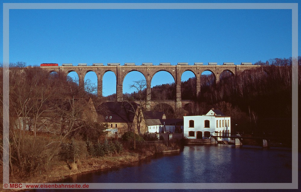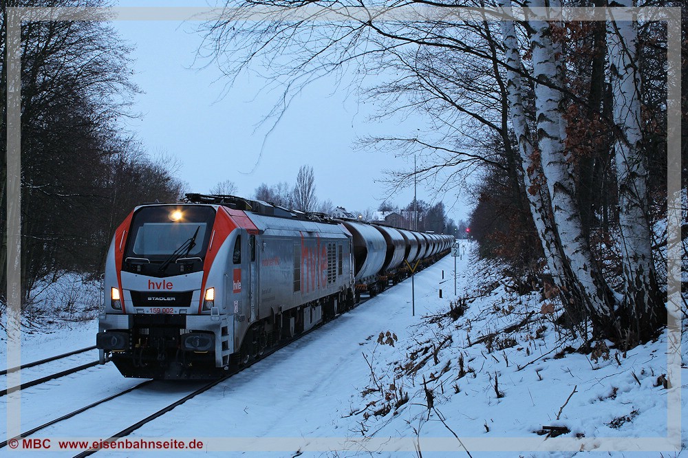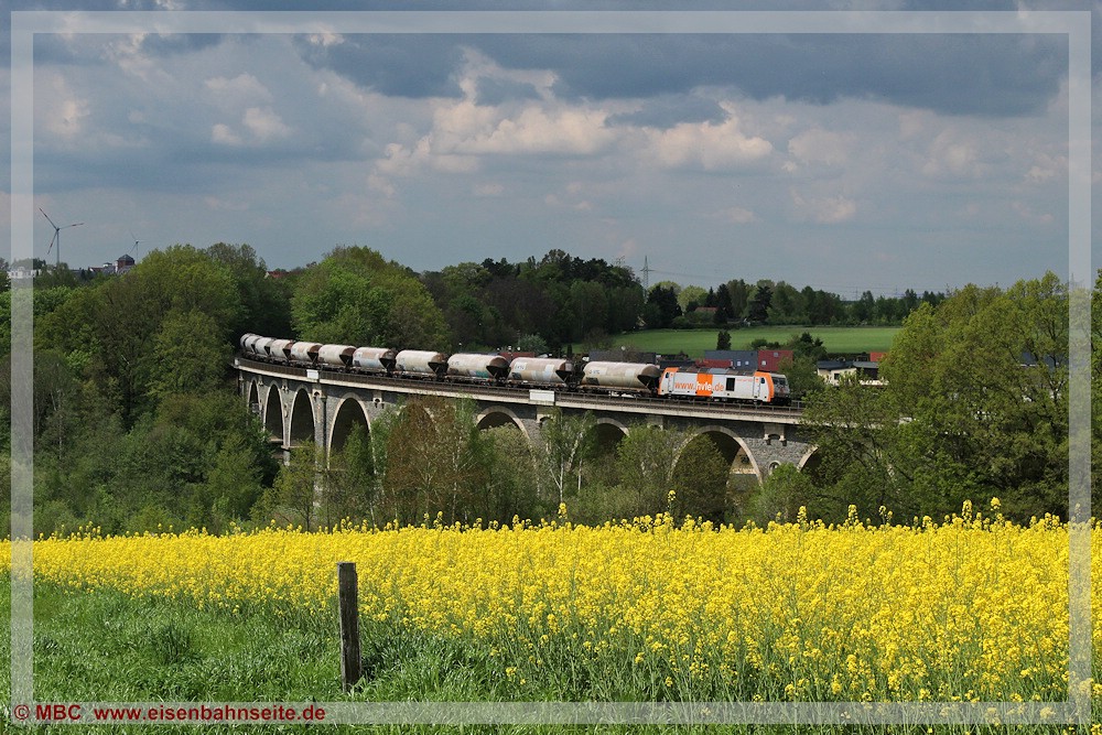 [120] Schadhafte Traktion stand in gewisser Regelmäßigkeit bei Kalk- und Kohlezügen zu Buche. Am Nachmittag des 25. April 2013 war eine havarierte 285 am Kalkzug der Grund für den Einsatz der Leipziger Bereitschaftsloks 218 390 und 218 831. Kurz nach Sonnenuntergang war der Train in Küchwald eingetroffen.[121] Die V 100-Doppeltraktion bestehend aus 203 105 und 203 143 am 26. Januar 2014 weckte Erinnerungen an die OHE-Zeit. Der Auftauschuppen hat seit 2024 lediglich Garagenfunktion.[122] Mehrmals kam es vor, dass eine Maschine mit dem Vollzug das Ziel noch erreichte, aber für die Rückfahrt eine Ersatzlok beordert werden musste. So auch am 18. November 2014: 285 001 ist an diesem trüben Dienstag nach Küchwald disponiert worden, um 263 005 und den Leerzug abzuholen. Die Fahrt geht in Richtung Chemnitz Hbf, was das Zurückdrücken in Richtung Wittgensdorf erfordert.[123] Je nach Zuglänge war eine zweite Lok aus Lastgründen mit von der Partie. Am Leerzug dürfte 285 102 nicht auf die Hilfe von 246 001 angewiesen sein. Für den Laien sind die Güter- und Personenzugvarianten nur an der Fahrtzielanzeige oberhalb der Frontfenster unterscheidbar. Das Foto zeigt den am 16. Juli 2017 in Chemnitz-Furth die Chemnitz querenden Leerzug. In Höhe des Zugendes leuchtet das Küchwalder Einfahrsignal.[124] Um zwei Wagen geringer ist die Zuglänge am 11. Oktober 2018, sodass 285 102 ihn allein vom Harz ins Erzgebirgsvorland traktionieren darf. Bei Wickershain rollt der Kalkzug über einen mittlerweile ersetzten Gewölbebogen vor der Kulisse Geithains. Die hvle mietete die Lok bis 2020 regelmäßig für ihre Zwecke.[125] Am 27. Juni 2019 überraschte mich der Leerzug in der Bahnhofsausfahrt Küchwald mit einer schwarzen G 1206 an der Spitze. Die Ordnungsnummer dieser 275 konnte bisher nicht ermittelt werden.[126] Die Tradition der Neulinge am Kalk, letzter Akt: Die Zweikraftlokomotive Stadler Eurodual erlebte (wahrscheinlich) ihre Premiere am 28. Januar 2021. Im Morgengrauen wartete 2159 002 mit dem Vollen in Cossen eine Zugkreuzung ab.[127] Der vorgezogene fotografische Abschied vom Kalkzug war für mich am 11. Mai 2023 als 285 001 die Wolkenlücke am Bahrebachviadukt in Chemnitz-Borna-Heinersdorf zufriedenstellend abpasste.