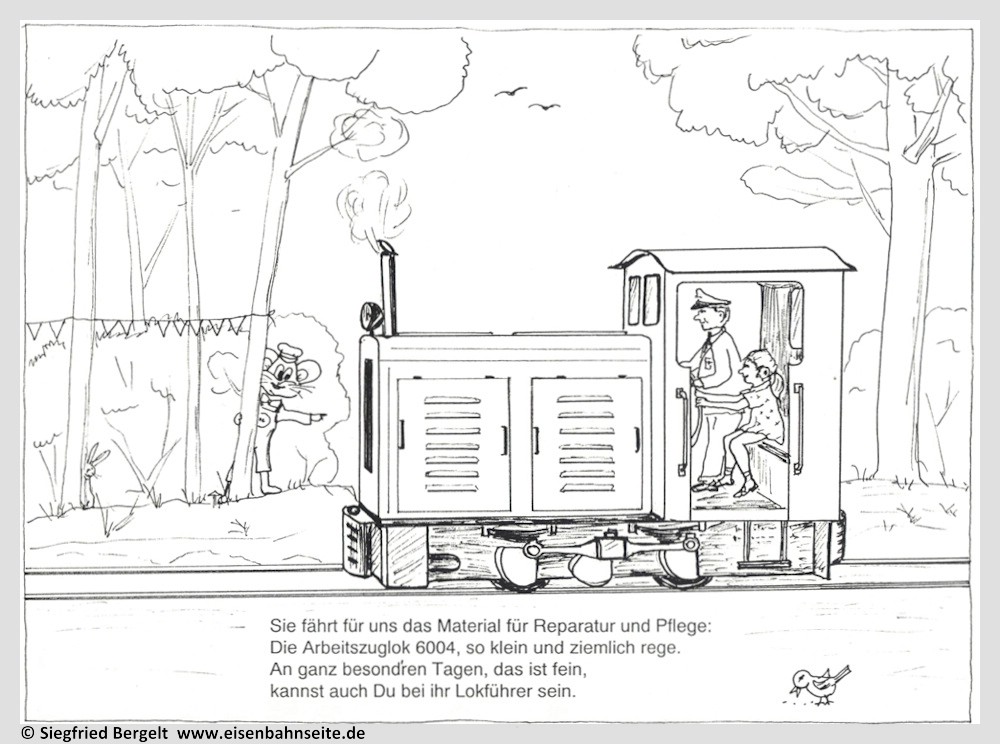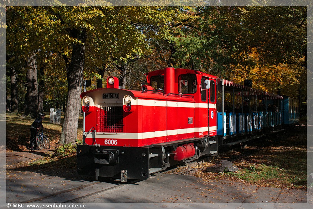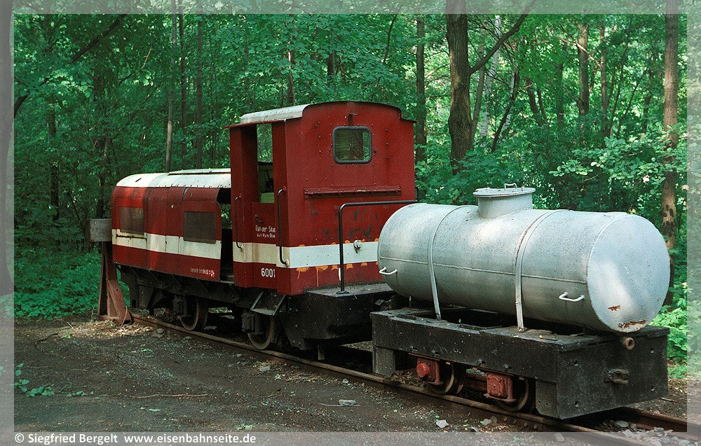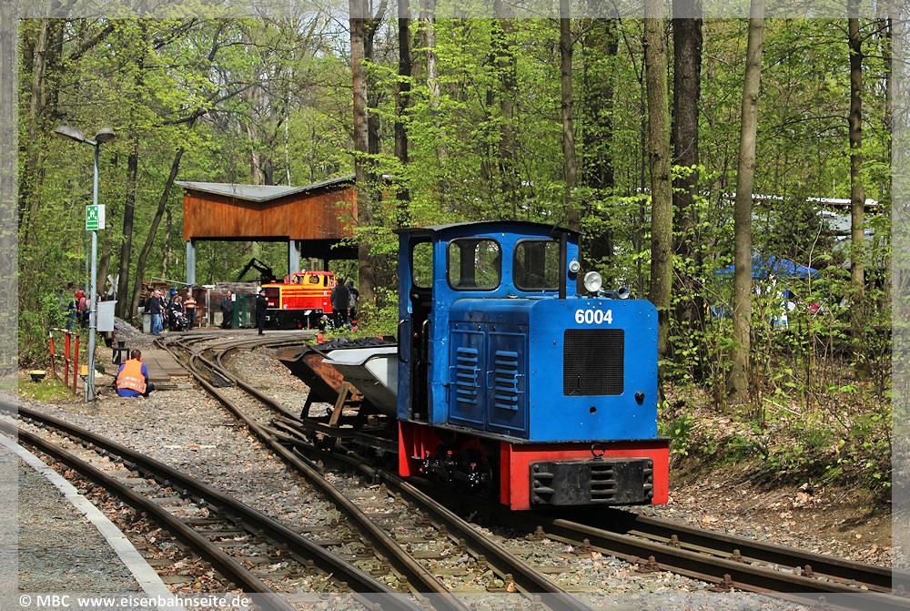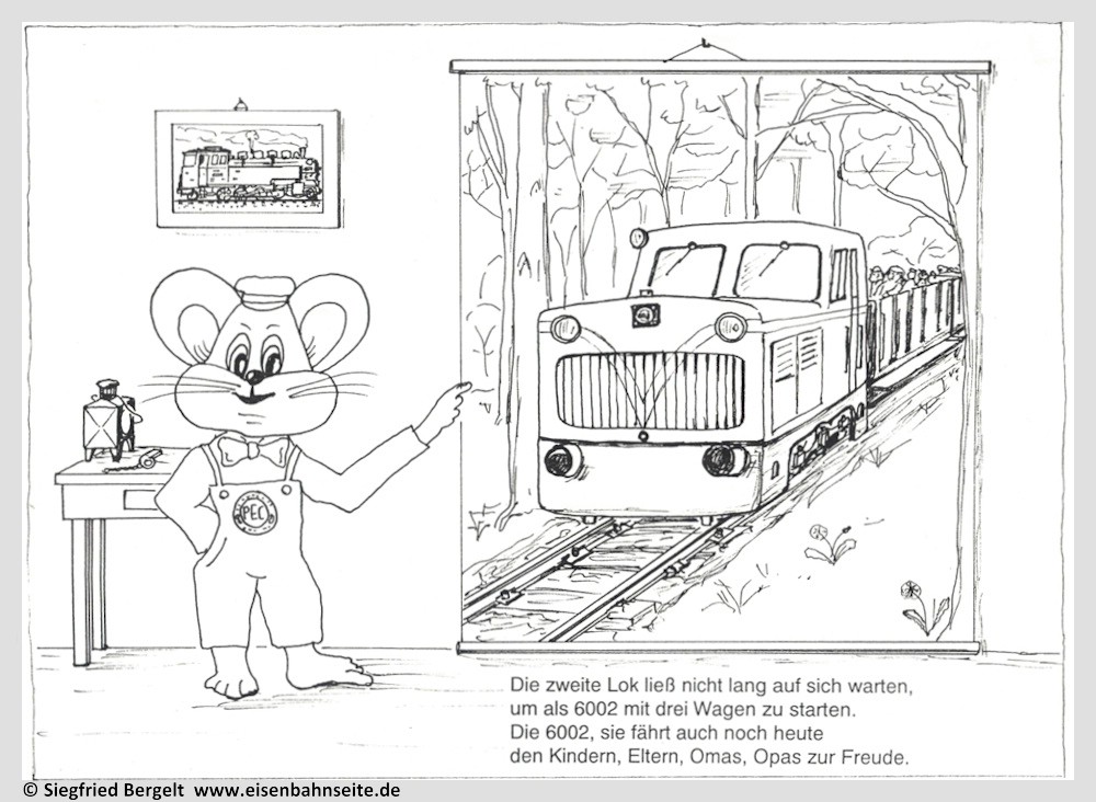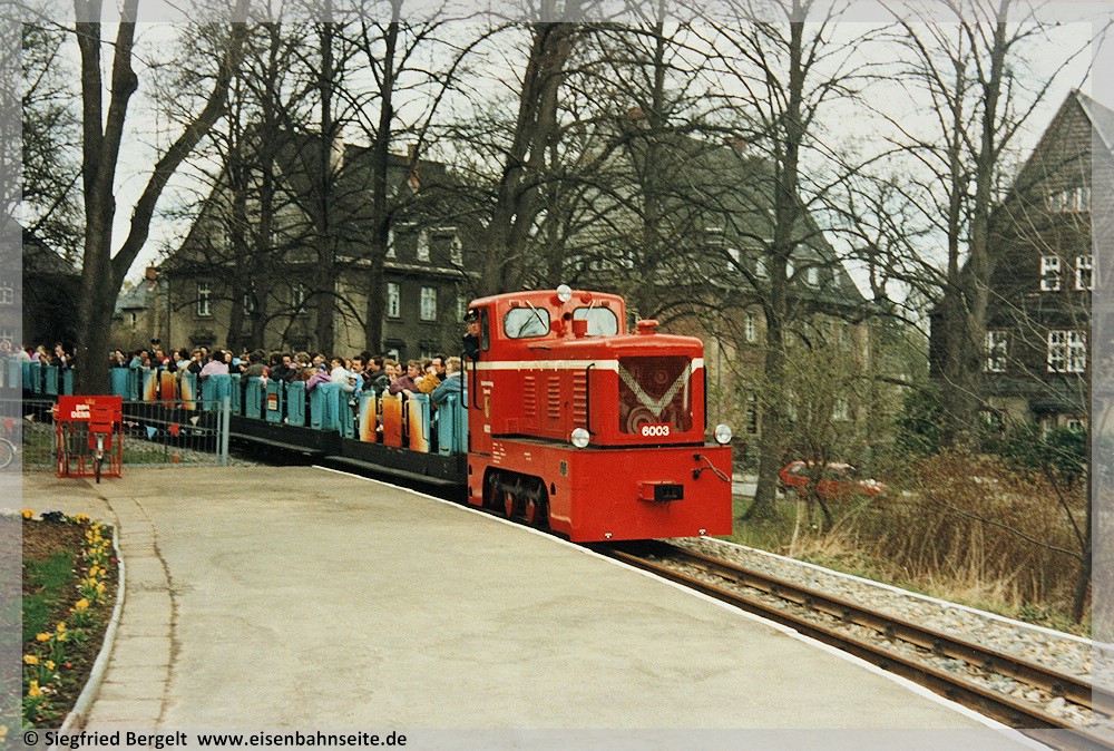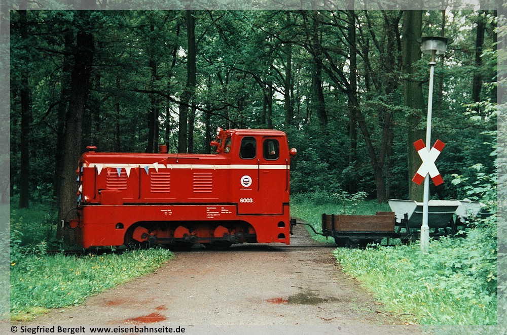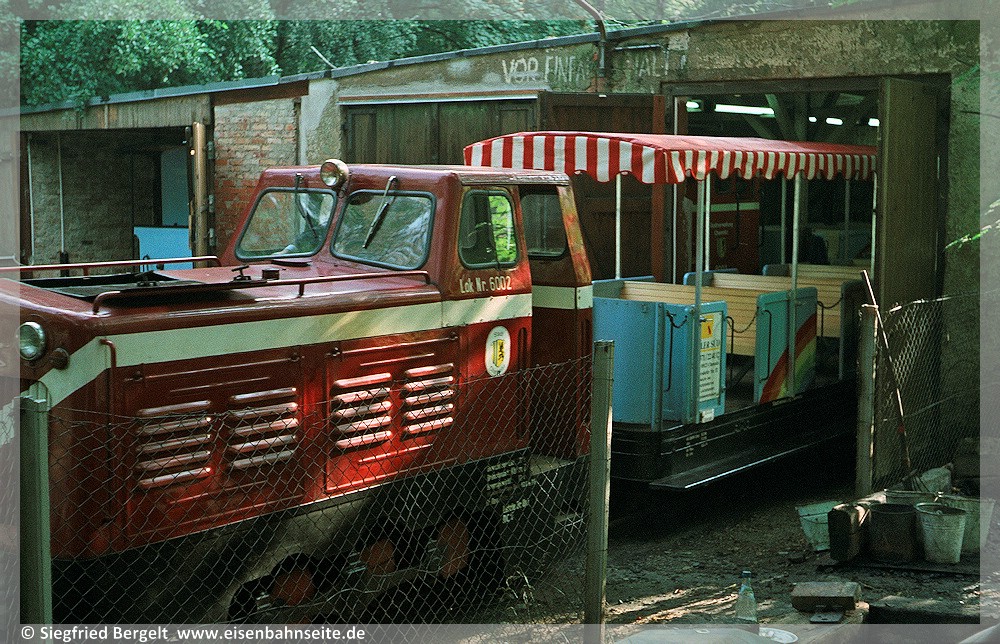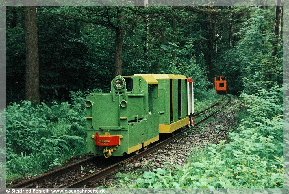 Im Gegensatz zur 6002 ist ihre Nachfolgerin eine Lok „von der Stange“: Eine V 10 C – die wohl gelungenste Feldbahndiesellok aus DDR-Produktion. In knapp 500 Exemplaren fertigte der Lokomotivbau Karl Marx in Babelsberg (LKM) diese Lok u. a. in den Spurweiten 600, 750, 900 und 1000 Millimeter. Die ab 1958 produzierte Regelspurdiesellok der Gattung V 10 B ist technisch eng mit ihr verwandt. 1983 erhielt die Pioniereisenbahn eine gebrauchte V 10 C vom VEB Ziegelwerk Hainichen. Die Babelsbergerin mit dem Baujahr 1971 musste u. a. von 900 auf 600 Millimeter umgespurt werden, um im Küchwald ihren Dienst aufzunehmen. Sie erfreute sich beim Personal großer Beliebtheit, was u. a. an dem im Vergleich zur 6002 ergonomischeren Führerstand lag. Mit 102 PS Leistung konnten nun in verkehrsstarken Zeiten auch Züge mit allen fünf Reisezugwagen problemlos gebildet werden. *[Martin 1996, S.54 zufolge, kam die 6002 bis in die 1980er-Jahre an Sommertagen auch vor Fünf-Wagen-Zügen zum Einsatz. Bildbelege dafür konnte ich bisher nicht finden.]