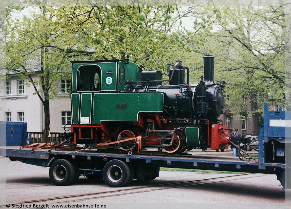 Bei dieser zweiachsigen Nassdampflokomotive handelt es sich um eine modifizierte Nachkriegsvariante des sogenannten Typs Riesa (Bj. 1948, 75 PS). 1994 bot ein Privatmann der Parkeisenbahn an, seine Dampflok im Küchwald einzusetzen. Der B-Kuppler hat seine ersten Arbeitsjahre bei der Baufirma Faber & Schnepp in Gießen verbracht. Anschließend wurde er als Denkmal in Großeichen aufgestellt. Der künftige Besitzer, Bernd Amende, entdeckte die arg verlotterte Lok im Jahre 1977 und ließ sie im Folgejahr gegen eine Diesellok austauschen. Im neuen Domizil bei den Frankfurter Feldbahnfreunden konnte die Lok nach einer Generalüberholung ab 1980 nach rund zwei Jahrzehnten wieder unter Dampf stehen. Weitere Lebensstationen bildeten das Viernheimer Schmalspurmuseum und die Parkeisenbahn Gera. Vor dem Einsatz in Chemnitz erhielt die Lok eine Druckluftbremsanlage.