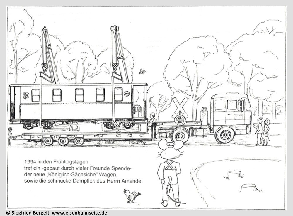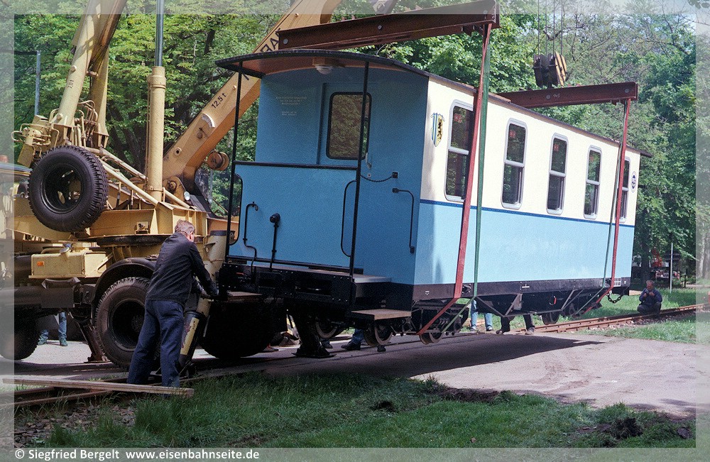 Die fünf ältesten Reisezugwagen sind im Reichsbahnausbesserungswerk Chemnitz (ab Mitte 1953: Raw Wilhelm Pieck Karl-Marx-Stadt) gefertigt worden. Sie stehen nach wie vor im Einsatz. Die Drehgestelle waren ursprünglich Lorengestelle. Inzwischen ist das Gros der Fahrzeugteile bei Hauptuntersuchungen ausgetauscht worden, die äußere Form der Wagen aber nahezu unverändert geblieben. Jeder Wagen verfügt über vier Abteile, deren Holzbänke jeweils sechs Personen Platz bieten. An den Stirnseiten befindet sich je ein Zugbegleiterabteil (vor Umrüstung der Bremsanlage ein Bremserabteil). Wagen Nr. 4 und 5 wurden etwa zeitgleich mit Lok 2 geliefert.
