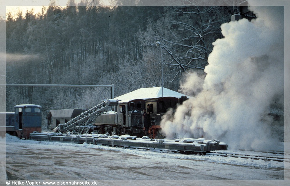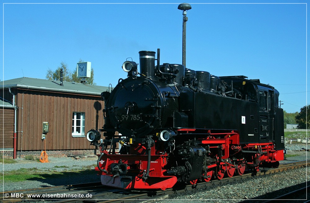[1] Für die meisten Freunde des Thumer Netzes ist die Babelsberger Neubau-„VII K“ wohl DAS Fahrzeug schlechthin. Die 1’E1′-Lokomotiven bildeten schließlich ab 1954 für die letzten beiden Jahrzehnte des Thumer Netzes das Rückgrat im Bereich Traktion. 99 785 wurde im November 1954 direkt beim Bahnbetriebswerk Thum in Dienst gestellt. Als einzige ihrer Baureihe besaß sie zeitweise um 1960 einen Rauchkammerzentralverschluss. Bei der Fichtelbergbahn – der aktuellen Heimat von 99 785 – erinnerte man seit der Hauptuntersuchung 2010 mittels Attrappe an dieses Unikat. Leider verlor sie das Alleinstellungsmerkmal nach einer Untersuchungsperiode wieder. Nach 99 787 war sie die „VII K neu“ mit der längsten Verweildauer auf Thumer Gleisen.