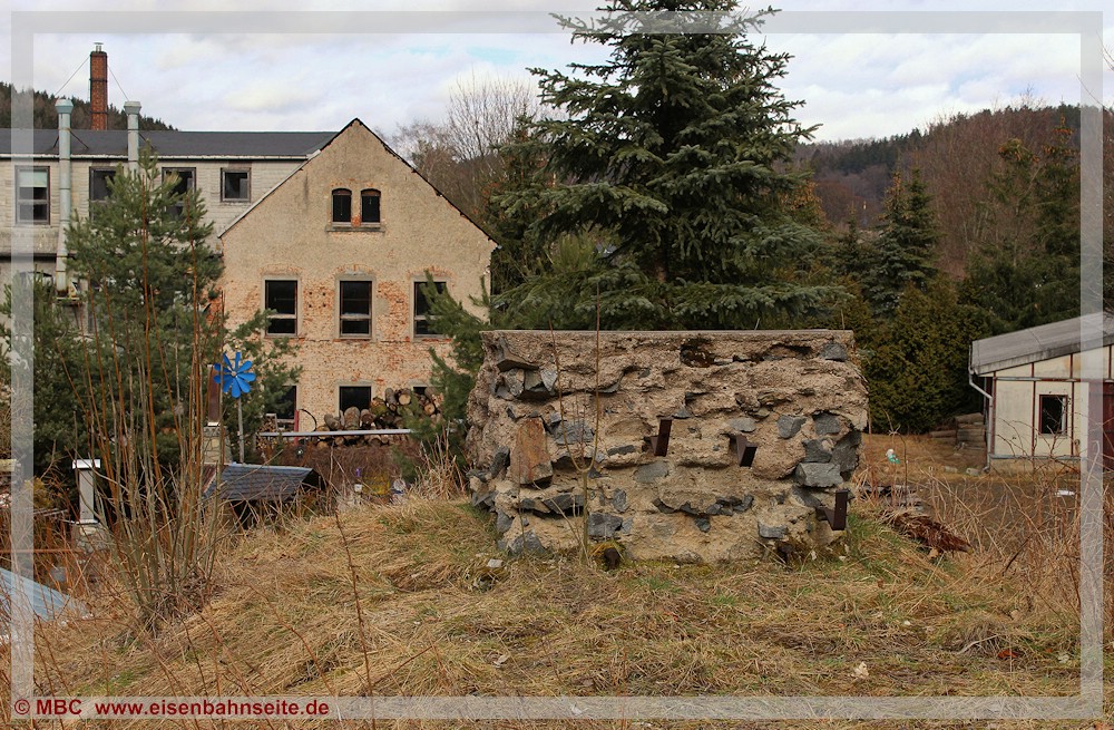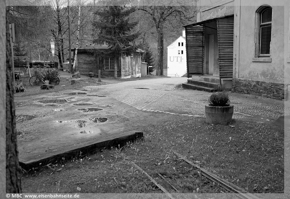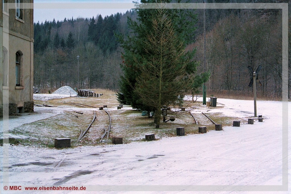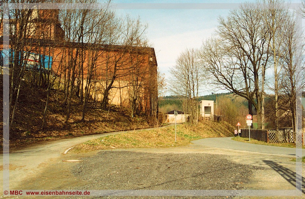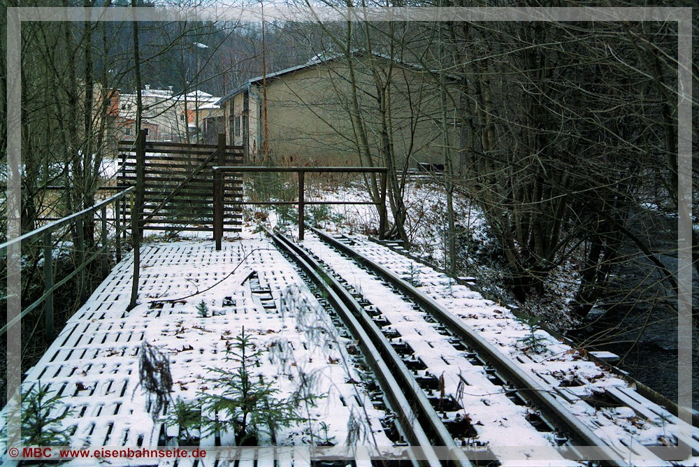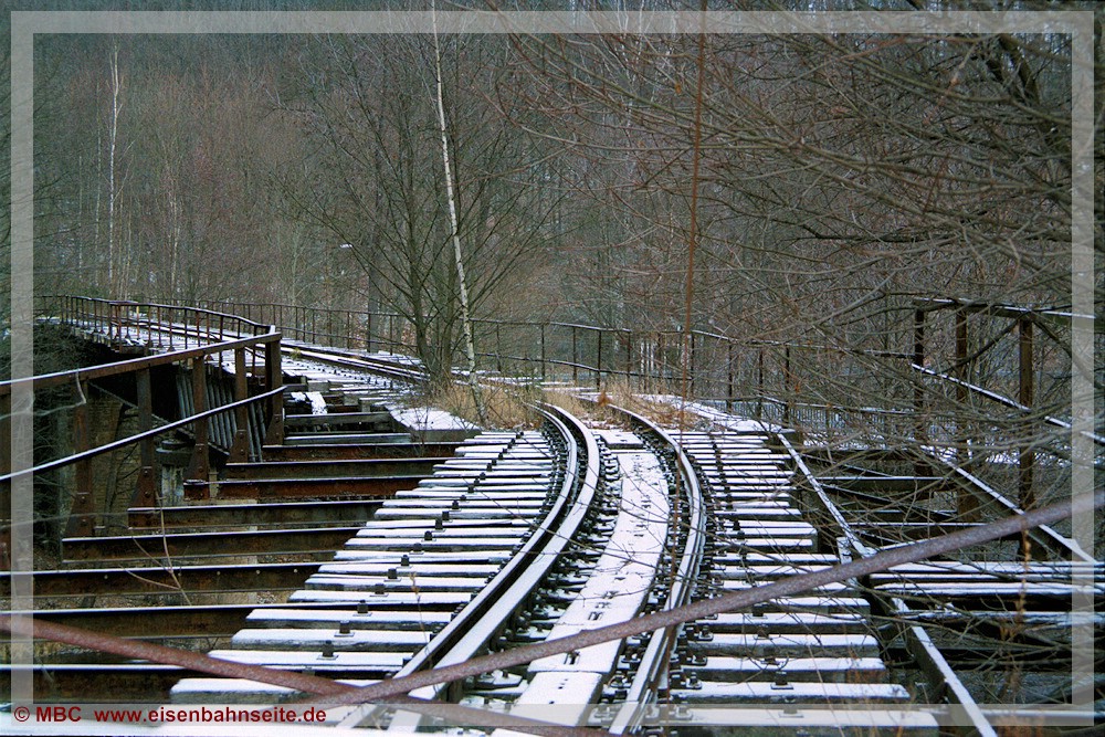 [31] Gut erkennbar ist der Niveauunterschied zwischen dem ansteigenden Verlauf des Anschlussgleises links und der Trasse nach Wilischthal im Gefälle. Links im Vordergrund lag die Einfache Kreuzungsweiche, durch welche der Werksanschluss zuletzt angebunden war (03/2002). Bei der Anschlussbedienung war zuvor unbedingt der Kesselwasserstand der Lokomotive zu prüfen. Wäre dieser unter dreiviertel gewesen, hätte es schlimme Folgen bis hin zum Kesselzerknall geben können!