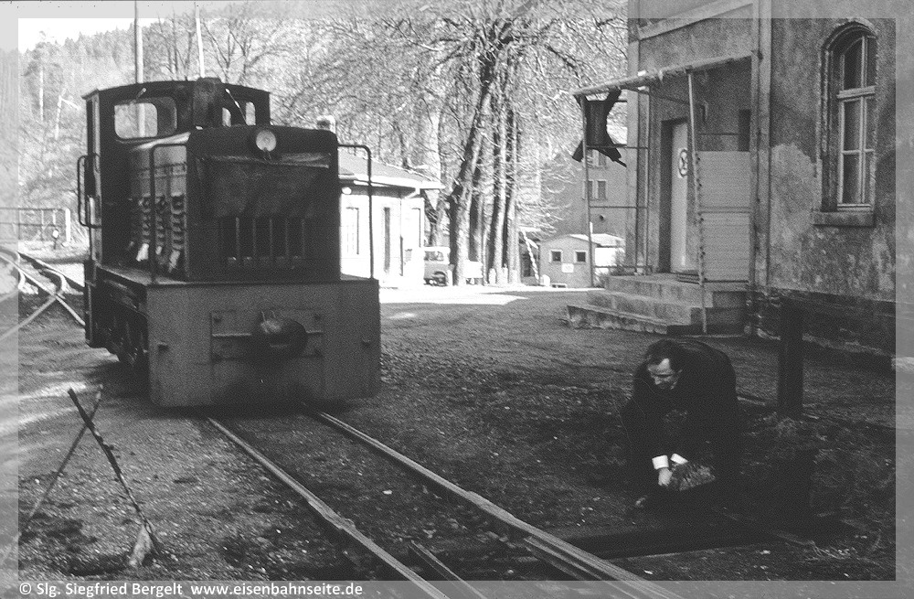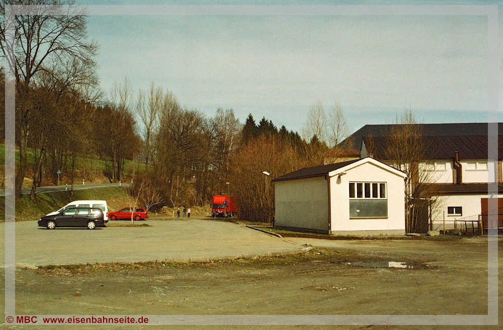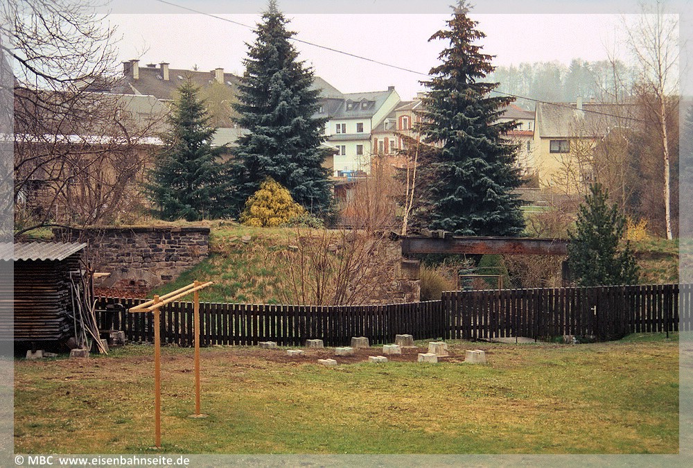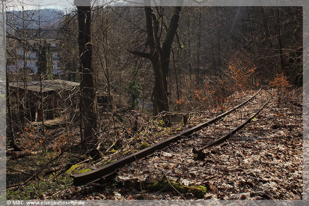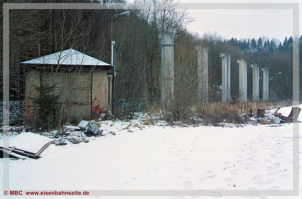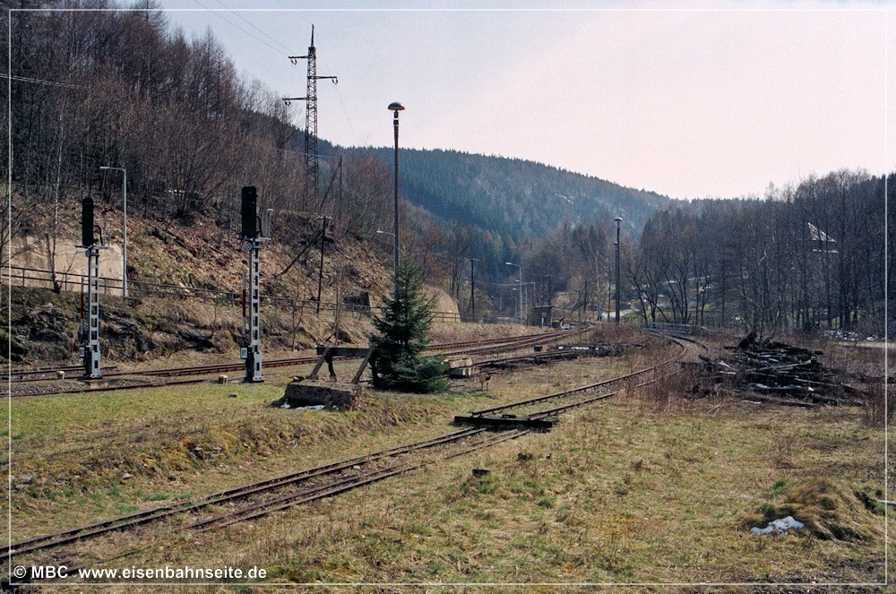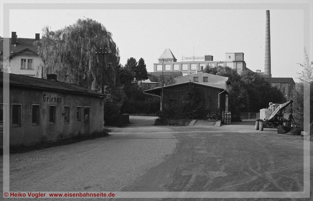 [31] Gut erkennbar ist der Niveauunterschied zwischen dem ansteigenden Verlauf des Anschlussgleises links und der Trasse nach Wilischthal im Gefälle. Links im Vordergrund lag die Einfache Kreuzungsweiche, durch welche der Werksanschluss zuletzt angebunden war (03/2002). Bei der Anschlussbedienung war zuvor unbedingt der Kesselwasserstand der Lokomotive zu prüfen. Wäre dieser unter dreiviertel gewesen, hätte es schlimme Folgen bis hin zum Kesselzerknall geben können!
