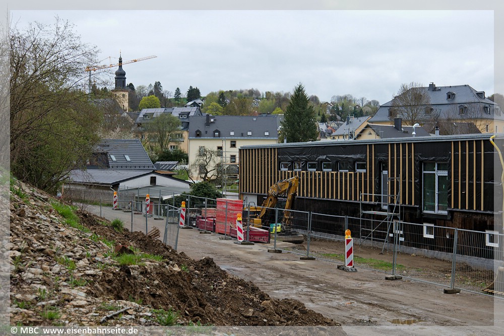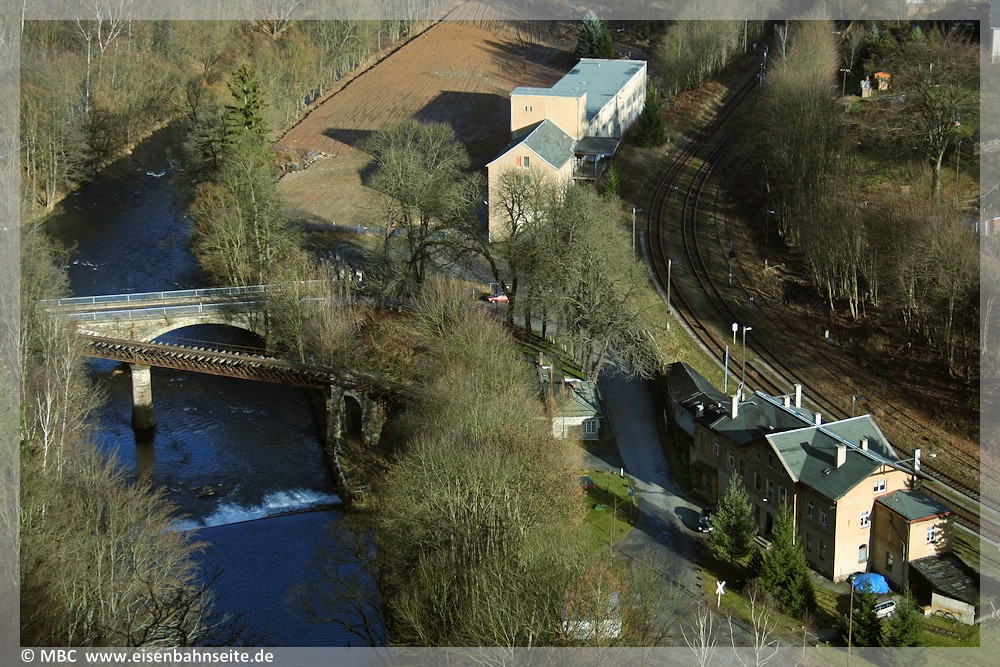[53] Am 27. Mai 1972 stand Siegfried Bergelt auf der Brücke des Warnermühlwegs und hielt den von 99 1778 bespannten, letzten Reisezug (P 2905) nach Wilischthal bildlich fest. Eine historische Ansicht dieses Motivs findet sich in dieser Bildergalerie (Bild 61 von 107).[54] Der Vergleich im März 2021: Links und rechts der Trasse wurde Erdreich abgetragen, um darauf Garagen zu errichten. Der Standpunkt ist im Vergleich zu 1972 etwas weiter rechts, deshalb ist die Thumer St. Annenkirche auch nach rechts gerückt.[55] Im April 2025 hat sich das Bild erneut gewandelt. Die Garagen sind verschwunden und links hat sich das Gelände scheinbar „zurückentwickelt“, während rechts ein neues Gebäude entstanden ist. Alle drei Aufnahmen eint rechts das markante Dach des Rathauses, ein ehemaliges Rittergut.