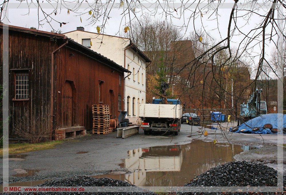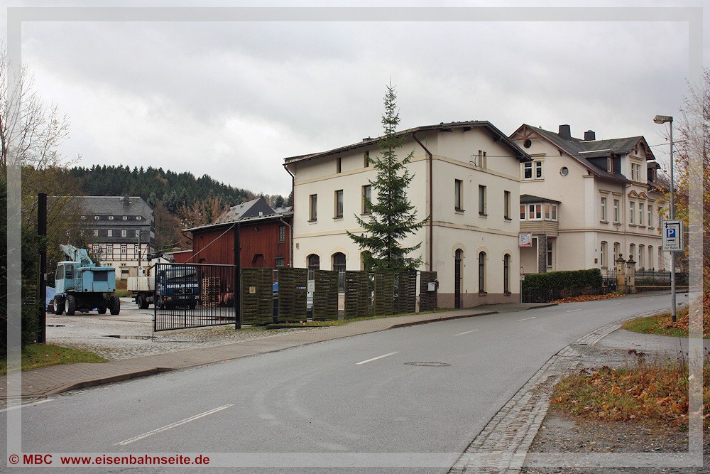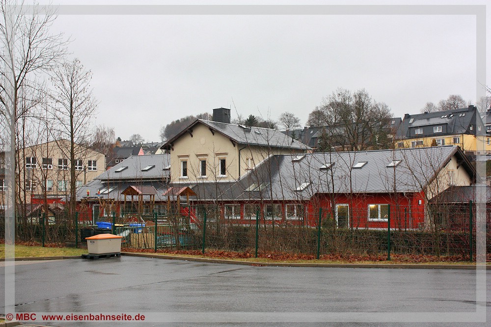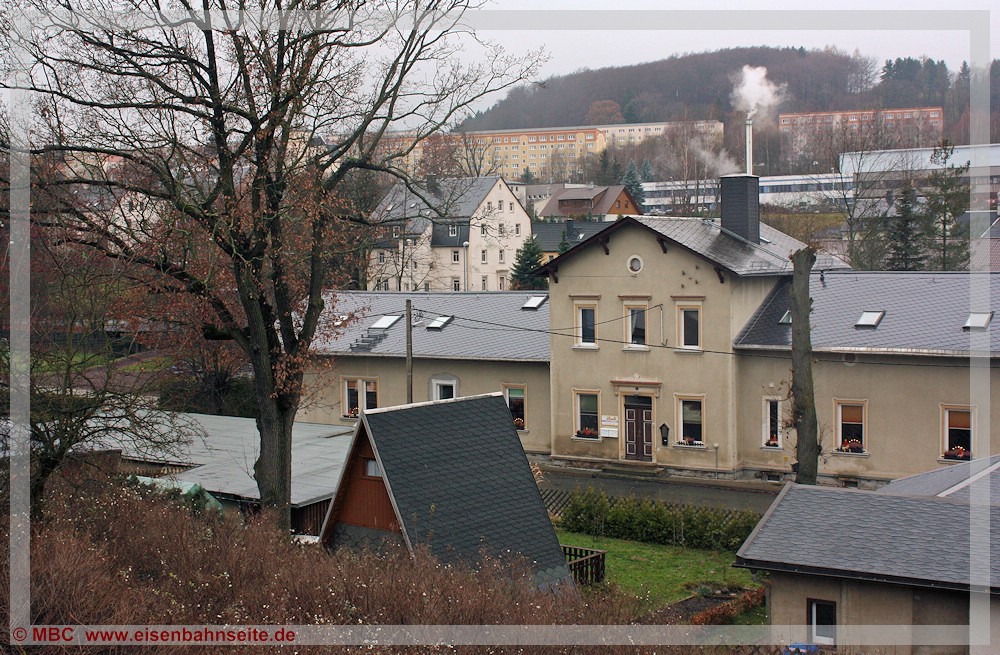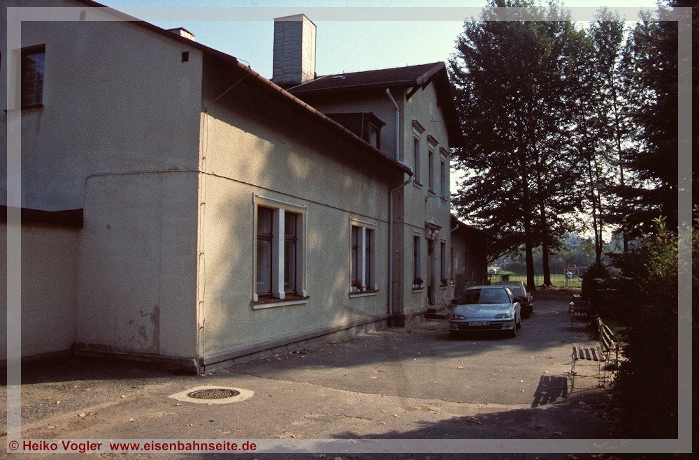 [49] Der Blick auf die ehemalige Gleisseite des alten Ehrenfriedersdorfer Bahnhofs in Richtung Streckenende am 25. September 1994.[50] Das Empfangsgebäude mit rechts angebautem Güterschuppen des alten Bahnhofs beherbergt schon seit einiger Zeit den Kinder- und Jugendverein Neuer Bahnhof Ehrenfriedersdorf e.V. In den 2000er-Jahren erfuhr das Gebäude auf der vormaligen Gleisseite geringfügige Erweiterungen. Am linken Bildrand befand sich der zweiständige Lokschuppen. Die Schuppentore zeigten in Richtung Streckenende.[51] Das EG mit umfunktioniertem GS von der Straßenseite. Der etwas langlebigere zweite Ehrenfriedersdorfer Bahnhof befand sich linkerseits am gegenüberliegenden Hang an der SM-Linie. Deren Trasse verlief unterhalb der Wohnblöcke im Hintergrund.