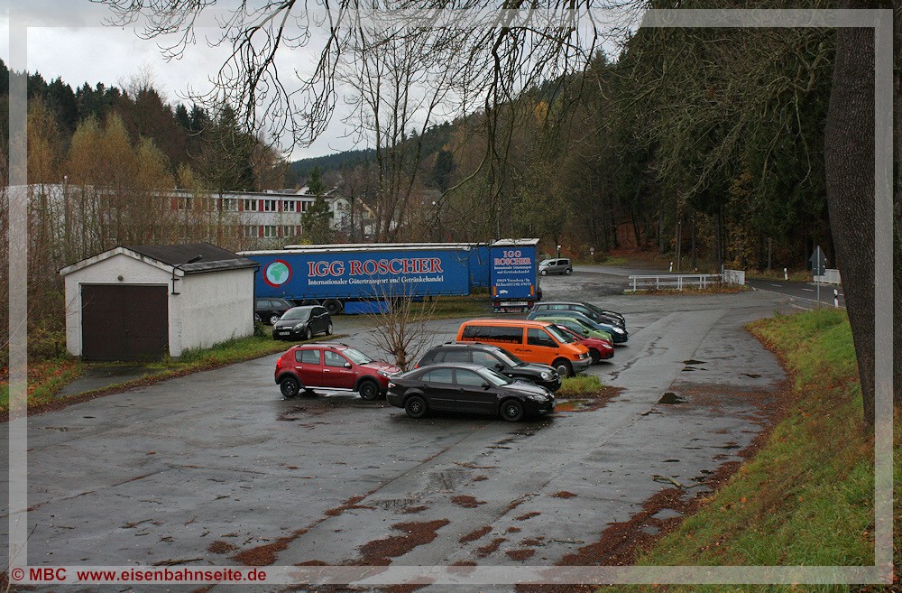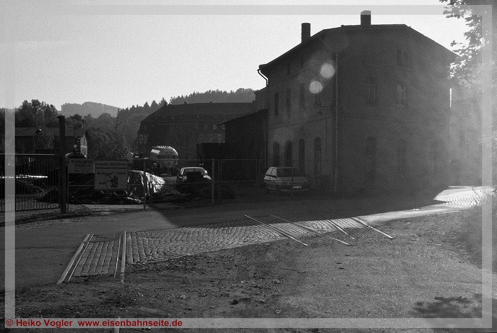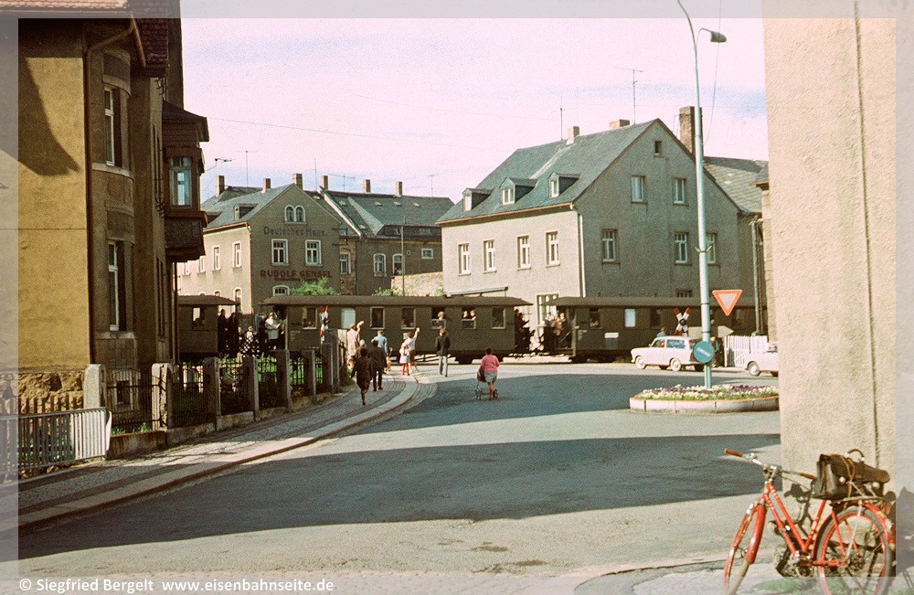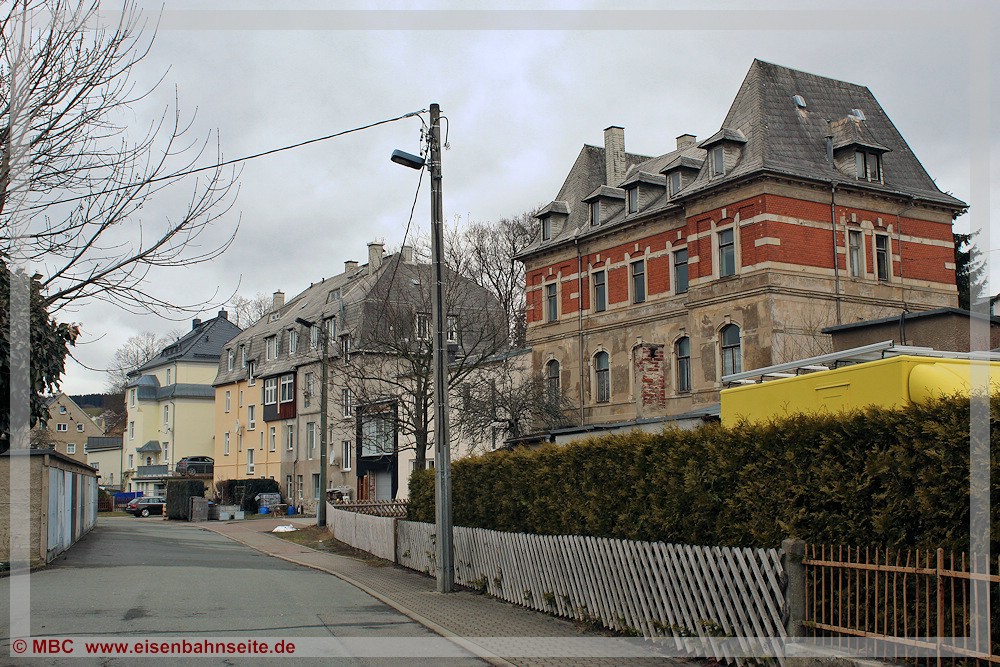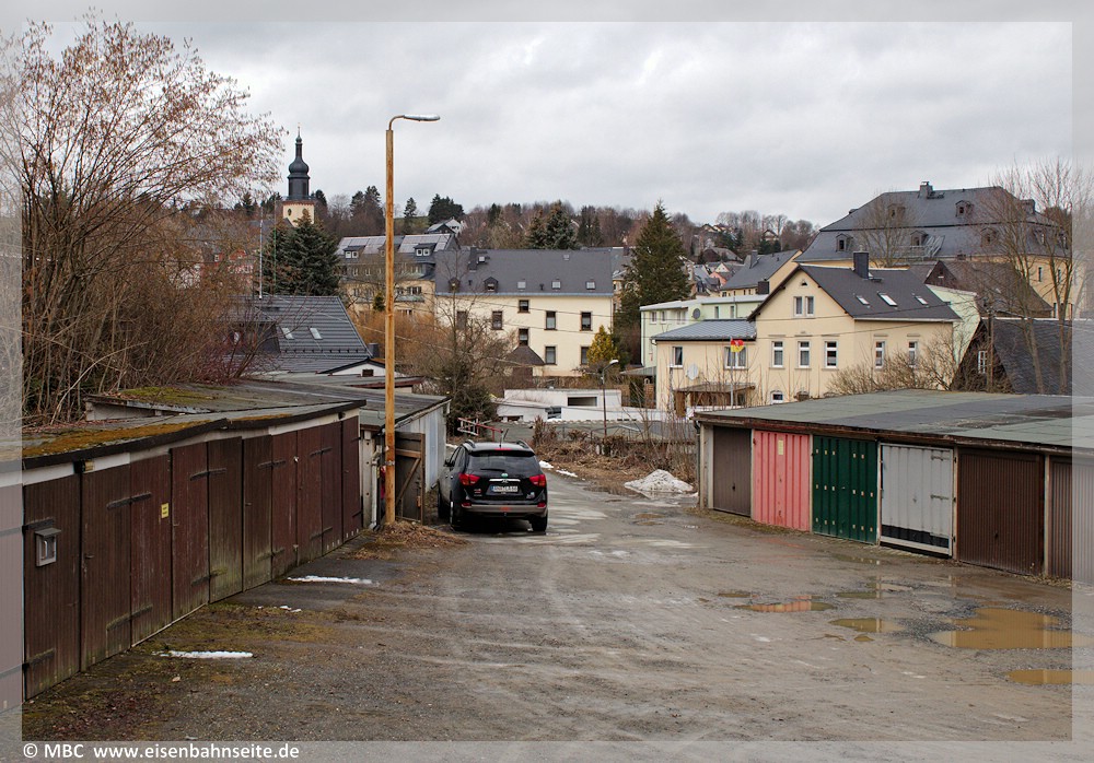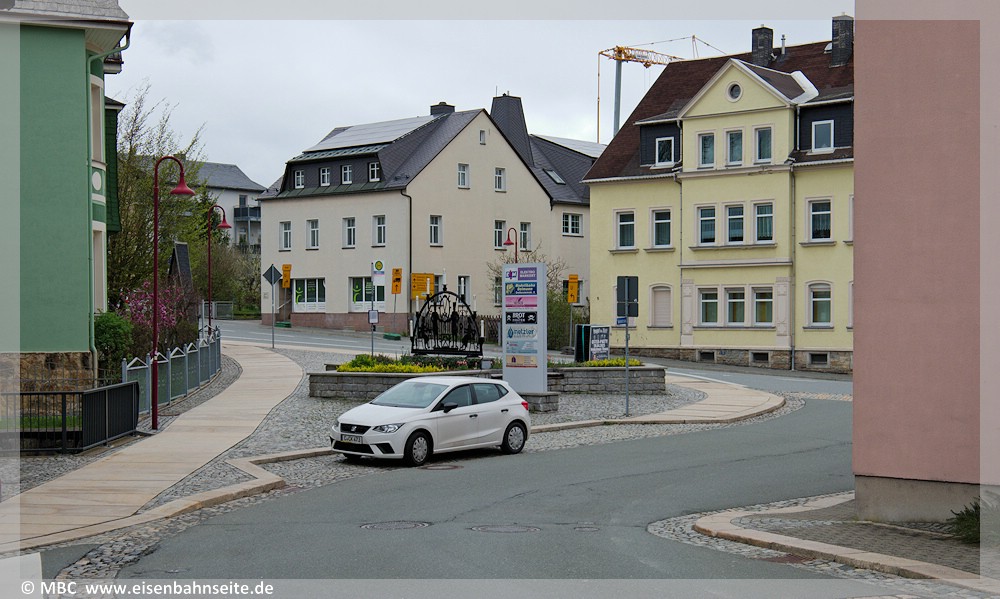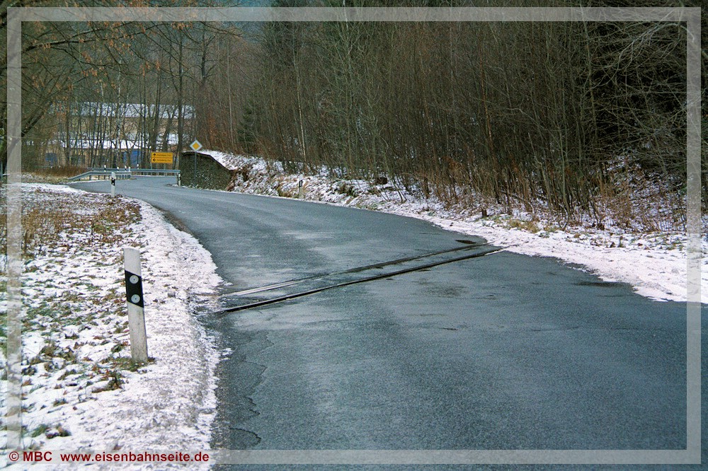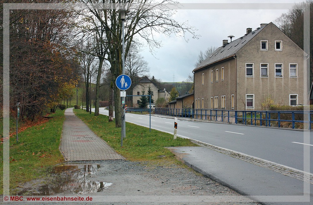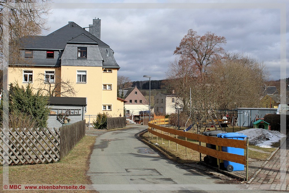 [57] Bereits in den 1930er-Jahren war der Bahnübergang mit Blinklichtern gesichert. Die hier am letzten Betriebstag von der Bahnhofstraße aus erkennbare Haltlichtanlage sei anschließend in Niederschmiedeberg (Preßnitztalbahn) wiederverwendet worden.[58] Für das Vergleichsbild habe ich mich etwas zu weit links postiert, dennoch ist die Stelle wiederzuerkennen.