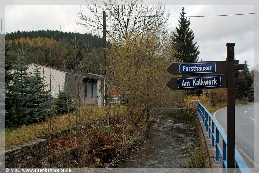 [39] Die Situation im November 2013, Blickrichtung Wilischthal: Links der Wilisch befand sich der Gleisanschluss des Kalkwerks. Die WT-Trasse verlief nach der Wilischquerung auf der rechts im Hintergrund erkennbaren Stützmauer und querte sogleich die Straße.