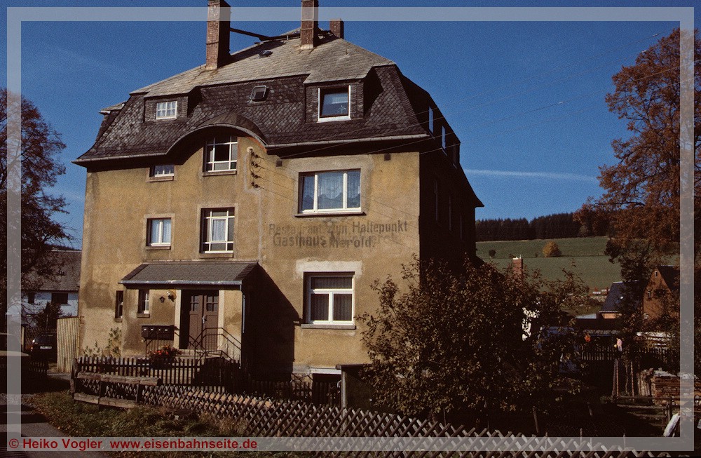 [41] Die 1928 erbaute Wartehalle in Mittelherold war identisch mit denen der Haltepunkte Siebenhöfen (später versetzt nach Geyer) und Auerbach (Erzgeb) an der SM-Linie. Als letztes seiner Art wurde das Gebäude im Sommer 2005 dem Erdboden gleichgemacht. Das Ende war im März 2002 schon absehbar, Blick in Richtung Wilischthal.[42] Der Haltepunkt lag in einer S-Kurve, Blick in Richtung Wilischthal (03/2021).[43] Sich teilweise überlagernde Schriftzüge waren 1994 noch an diesem Gebäude in Mittelherold lesbar, u. a. „Restaurant zum Haltepunkt Mittelherold.“ Bei einer Fassadenerneuerung 2001 verschwanden sie.