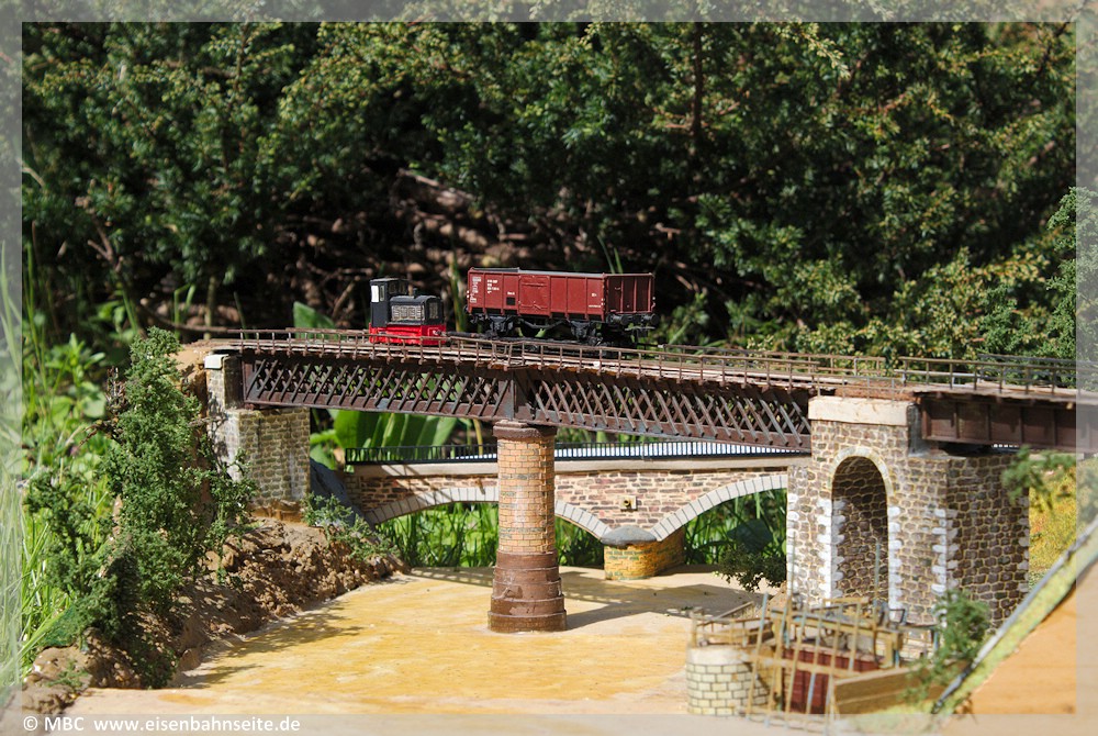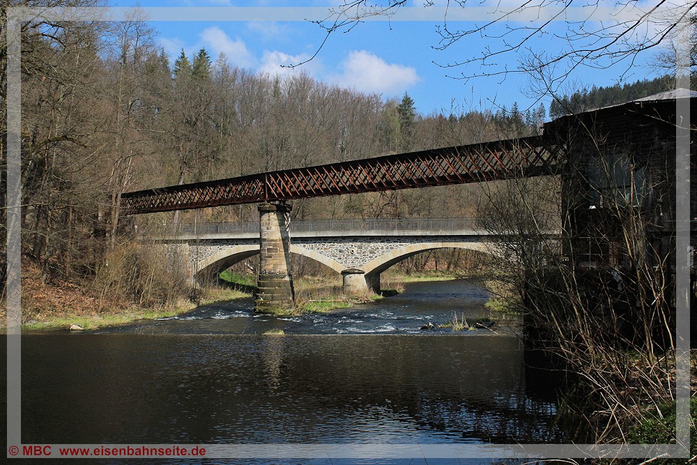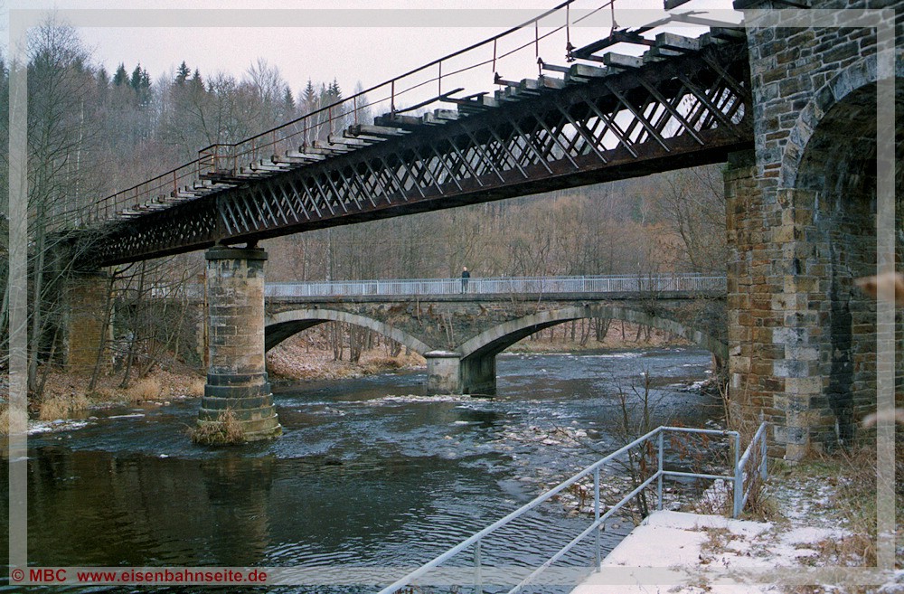 [15] Der Blick auf die Zschopaubrücke in Richtung Thum im Januar 2004.[16] Im Januar 2004 war die Wilischthaler Zschopaubrücke noch relativ vollständig erhalten und bereits gut ein Jahrzehnt befreit von jedweder Benutzung. Vater verweilt auf der benachbarten Straßenbrücke.[17] Auch im Frühjahr 2023 stehen die Wilischthaler Zschopaubrücken einträchtig nebeneinander, jedoch nicht unverändert. Während die Straßenbrücke saniert worden ist, beraubte man die Bahnbrücke im Sommer 2009 des Gleises, der Bohlen und ihres Geländers.[18] Noch einmal das Bergelt’sche Modell mit der deutlich gekürzten Brücke. Anhaltende Hitze scheint das Bett der Zschopau nahezu ausgetrocknet zu haben.[19] Unmittelbar nach der Zschopauquerung verlief das Gleis in einem Linksbogen auf einer kleinen Stützmauer parallel zur Wilischthaler Straße (S 231), die wenig später niveaugleich gequert wurde. Den Zustand dieses Streckenstückes im Januar 2004 mit Blick nach Wilischthal zeigt diese Abbildung.[20] Nachdem man das Gleis in diesem Bereich Mitte 2009 abbaute, brach man auch die Stützmauer ab. Im März 2021 erinnerte an dieser Stelle längst nichts mehr an die Wilischtalbahn.[21] Das Signal G sicherte die Einfahrt des Bf Wilischthal von Thum her. Ende Mai 1972 wurde es demontiert, doch der Sockel des Signalmastes existiert noch am Originalstandort. Im zweiten Quartal 2023 ist das unscheinbare Überbleibsel von einem Thumer Eisenbahnfreund optisch aufgefrischt worden.