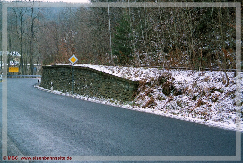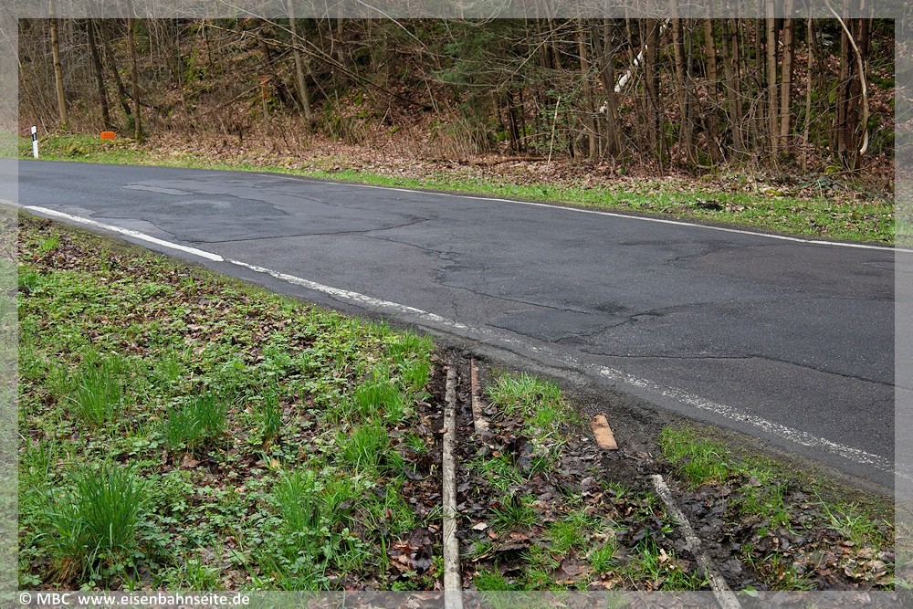 [22] Der Bahnübergang Wilischthaler Straße wurde im Laufe des Jahres 2004 (oder 2005) überteert. Warnkreuze oder sonstige Beschilderung, welche auf die noch vorhandene Gleisquerung hinwies, existierte im Januar 2004 längst nicht mehr. Der im vorhergehenden Bild gezeigte Signalsockel ist in Bildmitte erkennbar. Bis 27. Mai 1972 sah es hier so aus.[23] Der Zustand am Bahnübergang im April 2025: Unter der Bitumendecke liegt das Gleis noch. Auf einer Länge von zirka 300 Metern liegt das Schmalspurgleis in Richtung Thum nach wie vor. Die Trasse senkt sich kontinuierlich ins Tal der Wilisch hinab.[24] Zirka zwischen km 0,4 und 0,5 WT sichert eine Stützmauer zur Wilisch hin das Gleis. Der legendäre letzte Einsatz einer IV K auf diesem Streckenabschnitt, organisiert durch die IGP, fand am 14. Dezember 1991 statt. Die Kenner werden es wissen: An diesem Tag jährte sich die Eröffnung der Wilischtalbahn mit Zweigbahn nach Thum zum 105. Mal. Der offizielle Reiseverkehr startete zwar erst am 15. Dezember, jedoch erbat die Stadt Ehrenfriedersdorf am 14. Dezember 1886 einen „Extrazug“. Für die Planung der IGP spielte dieses kleine Jubiläum allerdings keine Rolle, es war reiner Zufall. [25] Schätzungsweise bei km 0,55 WT endet das Gleis seit Mitte der 2000er-Jahre. Schrottdiebe haben sich hier bereichern wollen, indem sie die Schienen brachial herausrissen. Vor der „Vollendung“ konnte die Aktion gestoppt werden. Nahezu exakt an dieser Stelle entgleiste im Frühling 1971 ein Rollwagen mitsamt aufgeladenem regelspurigen Klappdeckelwagen, dessen Kalkladung sich links des Bildes verteilte. Der Normalspurwagen lag noch tagelang umgekippt auf der Seite.