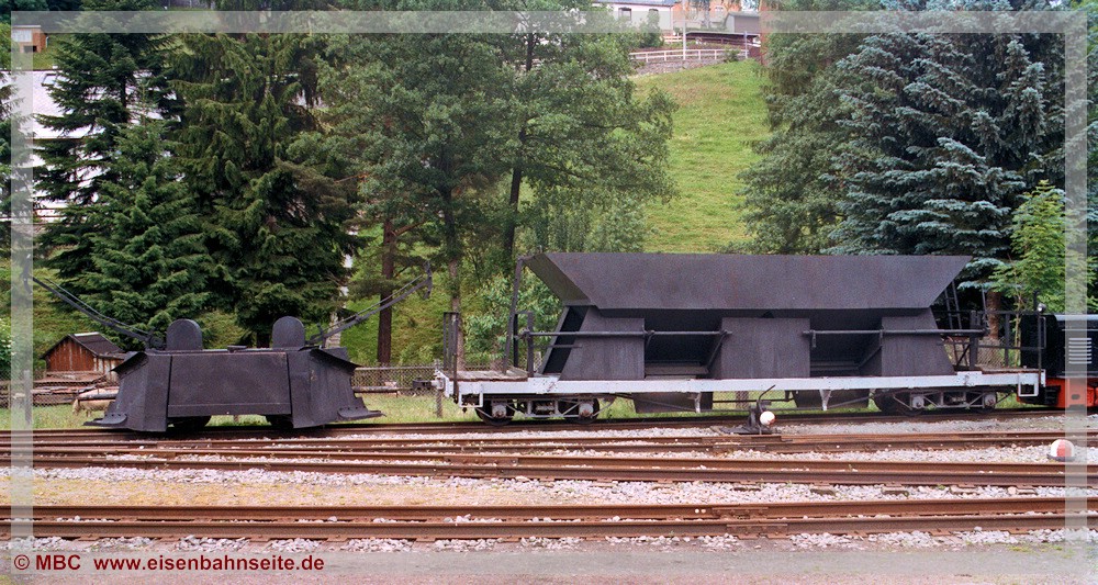 [27] Die Zufahrt zur Papierfabrik – unmittelbar hinter der Wilischbrücke beginnt das Werksgelände (01/2004).[28] Anfang des Jahres 2004 waren die Anlagen der Papierfabrik schon teilweise abgebrochen. Der Werklokschuppen existierte noch. Rechts des Abgebildeten befand sich ein Schleifereigebäude mit Gleiszufahrt. Reste einer Kranbahn, welche vorrangig dem Kohleumschlag diente, sind erkennbar. In den 1980er-Jahren erneuerte man die Werksgleise umfangreich. Diese barg die IGP bis 1995 für ihre Zwecke im Preßnitz- und Schwarzwassertal.[29] Die Papierfabrik Wilischthal besaß neben zwei Werkloks der Reihe V 10 C auch einige für interne Aufgaben vorgehaltene Werkswagen. Zu diesen zählte ein Schüttgutwagen der „Marke Eigenbau“, welcher 1985 auf dem Fahrgestell des OOw 97-20-06 entstand. Das Einzelstück hat im Sächsischen Schmalspurbahn-Museum Rittersgrün eine neue Heimat gefunden. Der links abgebildete zweiachsige Schneepflug 97-09-91 entstand 1955 im Raw Karl-Marx-Stadt aus dem Wagen 97-24-44. Nachdem der Schneepflug 1955-1960 (noch als 97-38-18 bezeichnet) bei der Trusebahn eingesetzt war, verdingte er sich einen Großteil seiner Winterdienstjahre ebenfalls im Thumer Netz. (Aufnahme vom Juli 2004)[30] Noch einmal zurück in die Papierfabrik als noch Eisenbahnbetrieb herrschte – und was für einer: An besagtem 14. Dezember 1991 war es erkennbar bitterkalt. Doch der erahnbar allerletzte Dampflokeinsatz im Wilischtal dürfte die Herzen der Eisenbahnfreunde zum Ausgleich ausreichend erwärmt haben. Zu den Fahrzeugen: Links die V 10 C (LKM Nr. 250218) mit zwei Rollwagen, dahinter der Schüttgutwagen, daneben die kalte 99 1568 und die unter Dampf stehende 99 1586. Die am 22. November 1991 durch die IGP von der DR erworbenen IV K 99 1542 und 99 1568 sind aus Platzgründen zunächst in diesem Anschluss abgestellt gewesen. Hinter den IV K befindet sich der Werklokschuppen. In diesem war die zweite Werks-V 10 C untergebracht, die 1985 von der Papierfabrik in Schönfeld abgekaufte LKM Nr. 250337.
