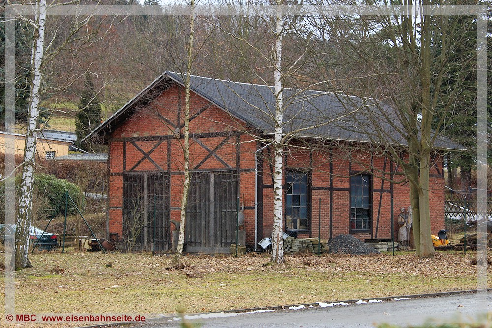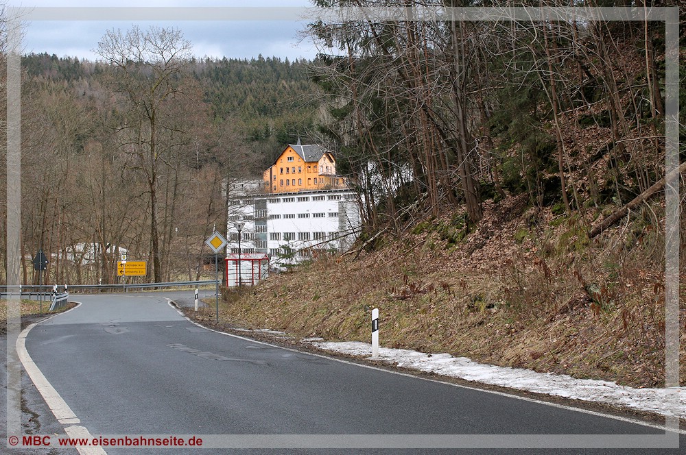 [37] Von der Eisenbahn zeugt in Venusberg-Spinnerei noch der Lokschuppen. Er beherbergte bis 27. Mai 1972 die Werklok des VEB Feinspinnerei, eine Ns 4 mit der LKM Nr. 250029 – die spätere 199 007. Sie ist heute bei der IGP in Jöhstadt zuhause. Die Insellage der hölzernen Stationsgebäude, u. a. eine Wartehalle mit sechseckigem Grundriss, war vor den Autos. Rechts lag das Streckengleis im Bogen, was noch gut an der Graskante erkennbar ist.[38] Die Situation in Gegenrichtung (Wilischthal) im März 2002. In Höhe des Fotografen zweigten zwei Anschlussgleise zur Feinspinnerei (Werk II) rechts ab und querten die Wilisch auf einer Brücke.