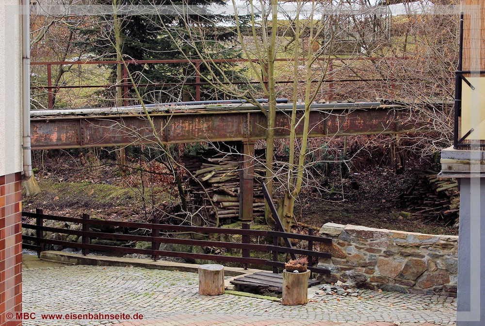 [52] Etwas versteckt hat die Querung des Jahnsbachs mit Stützpfeiler bis heute am Ortseingang Thum die Zeiten überdauert, Bild vom 11. März 2021. Diese Brücke ist auch im April 2025 vorhanden, jedoch – ohne Privatgrundstücke zu betreten – nur aus diesem Blickwinkel halbwegs einsehbar. Vor einigen Jahren war sie auch von der oberhalb verlaufenden B 95 aus noch gut zu erkennen.