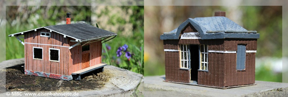 [2] Im April 2002 entstanden diese beiden Modelle aus Pappe. Links der Jahnsbacher Güterschuppen, rechts die Wartehalle aus Mittelherold. Höheren Ansprüchen genügen die Nachbildungen freilich nicht, dennoch sind sie eine schöne persönliche Erinnerung.