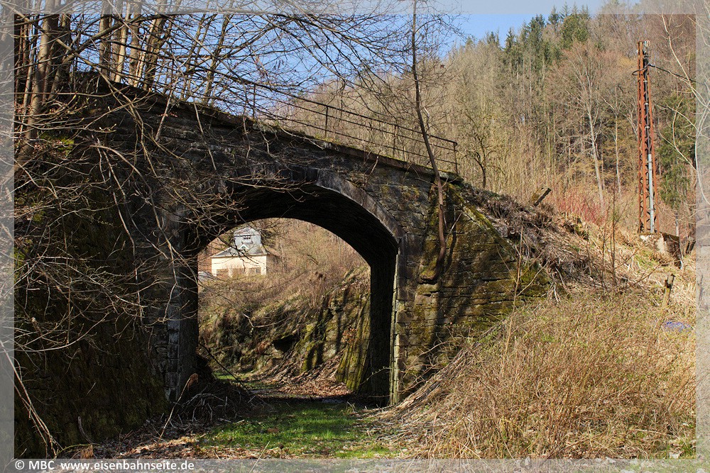 [56] Kurz vor dem BÜ mit der F 95 befindet sich eine weitere Jahnsbachquerung, worauf im April 2002 noch zwei Bahnschwellen zu erkennen sind. Links davon ist ein gemauerter Grabendurchlass erkennbar. Diese Relikte existieren im April 2025 nahezu unverändert, sind aber aufgrund des stark vorangeschrittenen Bewuchses kaum noch einsehbar.