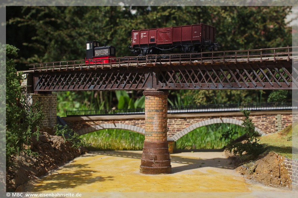 [3] Insbesondere der Ausflug zu den Resten der Wilischthaler Anschlussbahn im Januar 2004, von dem in diesem Beitrag noch einige Bilder folgen werden, inspirierte mich zum Nachbau der Wilischthaler Brücke. In einigen Schreibtischstunden entstanden die – gekürzten – Fachwerkträger aus Pappe und wurden – soweit ich erinnere – vor der Endmontage lackiert. Hier war schon ein bisschen mehr Ausdauer notwendig. Als dies geschafft war, war diese bei mir aber zunächst auch wieder erloschen. Zwar reichte es noch für eine Pappattrappe von 199 007 und die (Mit-)Gestaltung der Pfeiler und Widerlager. Alles weitere (Rohbau Pfeiler/Widerlager, Bohlen/Geländer, Wehr, Straßenbrücke, Landschaft) nahm mein Vater in die Hand. Auch dieses gut 20 Jahre alte Diorama ist nicht perfekt, aber mit etwas Feintuning auf jeden Fall eine Augenweide.