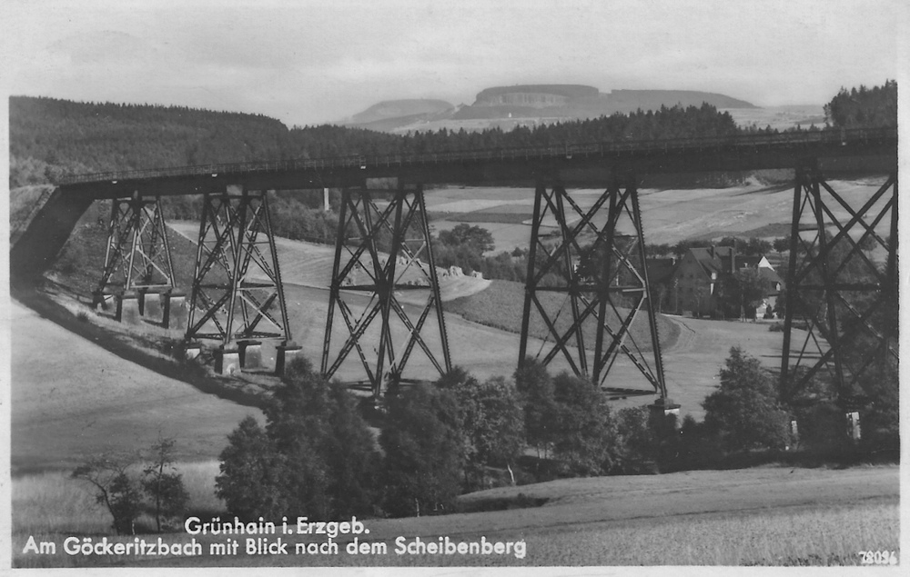 [28] Die seinerzeit fünftgrößte sächsische Stahlbrücke zierte Ansichtskarten. In diesem Blickwinkel ist kaum zu erkennen, dass sich das Bauwerk in Fahrtrichtung Scheibenberg in Rechtsbogenlage befindet. Die Brücke hatte insgesamt acht Gerüstpfeiler.[29] Der Blick in Richtung Grünhain/Zwönitz im Februar 2023. Nachdem die Gerüstpfeiler 1977 mit einer Planierraupe umgerissen wurden, blieben von diesem herrlichen Bauwerk nur die Fundamente und Widerlager übrig. Die Vernichtung von Eisenbahnbrücken im Erzgebirge erreichte in diesem Jahr ihren traurigen Höhepunkt, siehe Greifenbachtal usw.