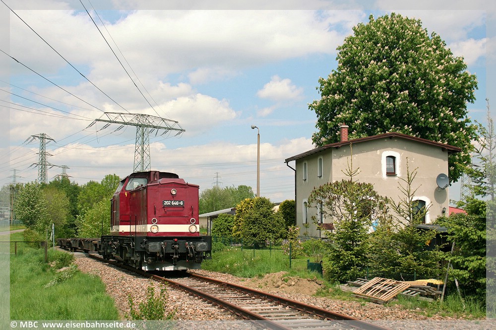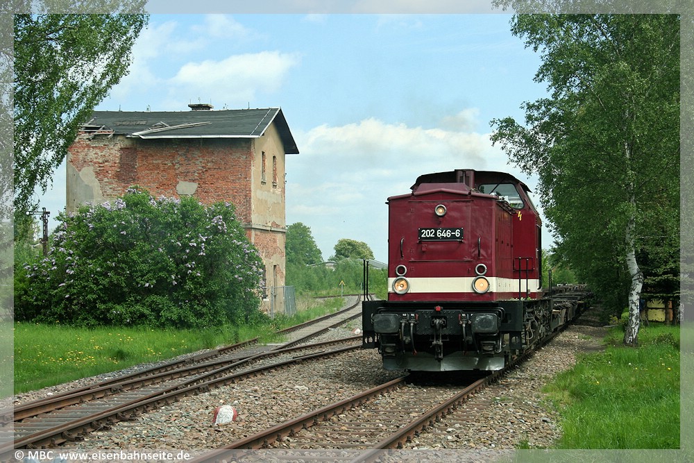 [9] Der Blick zum Posten 1 in Richtung Scheibenberg. Während das Gleis nach dem BÜ heute nach rechts schwenkt, verlief die ZS geradeaus weiter.[10] Am 13. Mai 2009 zieht 202 646 – damals in Diensten von DB Erzgebirgsbahn – abgestellte Containertragwagen aus der Abstellung in Zwönitz, um Platz für den Unkrautbekämpfungs-LKW zu schaffen. Das Postenhaus 1 zeigt sich frisch verputzt. In Höhe der V 100 stand bis zirka 1950 das Einfahrsignal T des Bf Zwönitz.