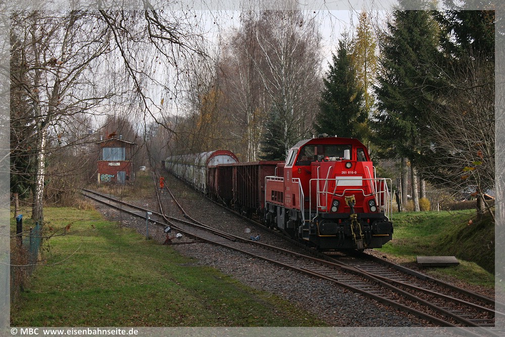 [2] Die Züge nach/von Stollberg und Scheibenberg nutzten in Zwönitz regulär die Südseite des Bahnhofsgebäudes. Die nach der Stilllegung von ZC und ZS verbliebenen zwei Gleise blieben bis 2021 erhalten, hier der Zustand im März 2003. Im August 2005 und 2006 stand jeweils noch einmal der VSE-Zug mit 50 3616 an dieser Stelle.[3] Im Februar 2023 ist das EG zum privaten Wohnhaus umfunktioniert und von den Gleisen nichts übrig.[4] Der Blick auf die Streckengabelung nach Scheibenberg links und Adorf rechts. Im Zentrum steht die Stellerei 2. Sie entstand 1899 zusammen mit der ZS und war zum Aufnahmezeitpunkt – März 2003 – noch besetzt. Links konnten die aus Stollberg ankommenden Dampfrösser am Wasserkran ihren Durst stillen. Das tat vor der Bergfahrt dringend Not![5] 21 Jahre später war es in Zwönitz längst recht trostlos, zumindest in diesem Bahnhofsbereich. Die beiden Gleise verschwanden 2021.[6] Das nach 2010 abgebrochene Wasserhaus stand in Insellage zwischen den Strecken. 202 646 zieht die abgestellten Containerträger in Richtung Scheibenberg, 13. Mai 2009.[7] Wie auf den meisten Bahnanlagen hat sich auch in Zwönitz der Baumbestand in den vergangenen Jahren prächtig entwickelt. Stellwerk 2 ist hinter dem frischen Grün noch vorhanden, das Wasserhaus ist längst weg. Von den Scheibenberger/Stollberger Bahnsteiggleisen blieb nur ein Stummel der Awanst-Schutzweiche.[8] Die letzten auf Stollberger/Scheibenberger Seite abgestellten Wagen waren geschlossene Autotransporter von CarRailLogistics, welche am 04.12.2010 den Weg nach Zwönitz fanden. Die Abholung der Wagen erfolgte knapp vier Jahre später, am 15.11.2014, mit 261 016 und 261 062. Die offenen Güterwagen fungieren als Bremswagen.