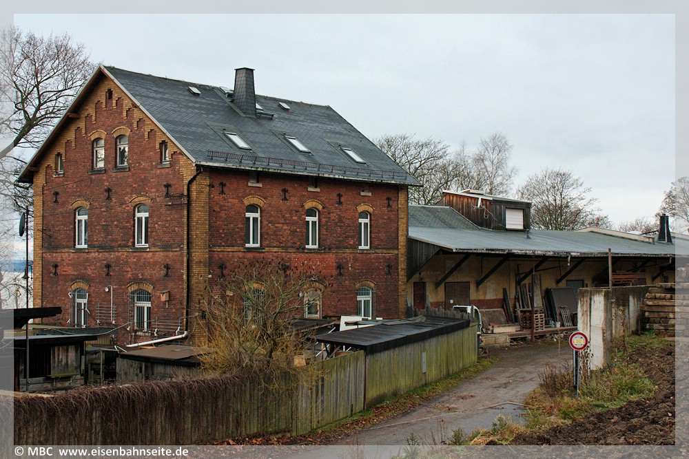 [35] Das EG mit angebautem GS in der Ursprungsform von der Gleisseite in Richtung Scheibenberg, Februar 2023. Zwischenzeitlich war der GS mit einem Anbau – dem Leßmüllerschuppen (vgl. Schlegel 2025, S.87) – 1914 nahezu verdoppelt worden. Dieser ist aber längst wieder verschwunden.
