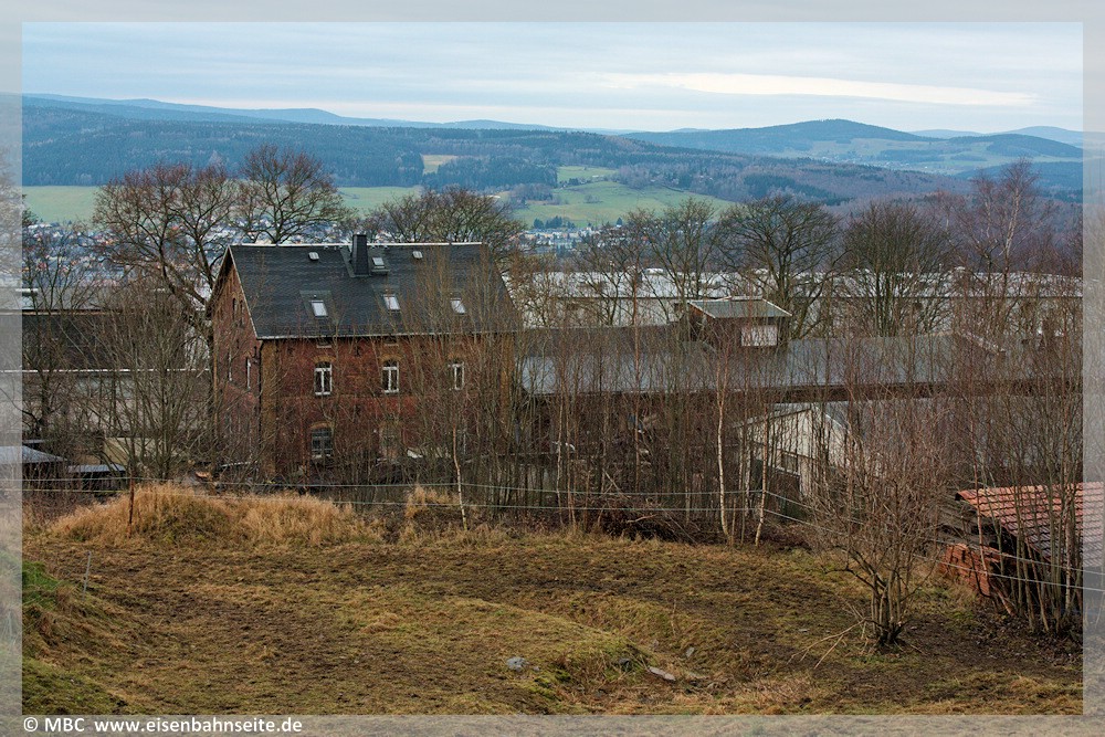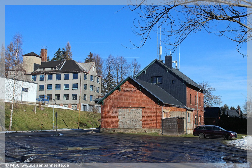 [22] EG und GS in Bernsbach von der ehemaligen Gleisseite im Dezember 2014.[23] Von hier bis Beierfeld bot sich dem Fahrgast in Fahrtrichtung rechts ein Erzgebirgspanorama.