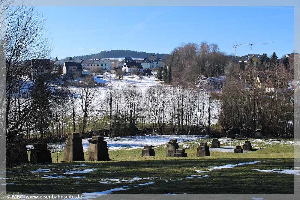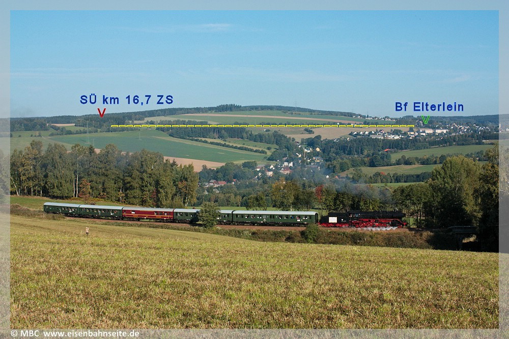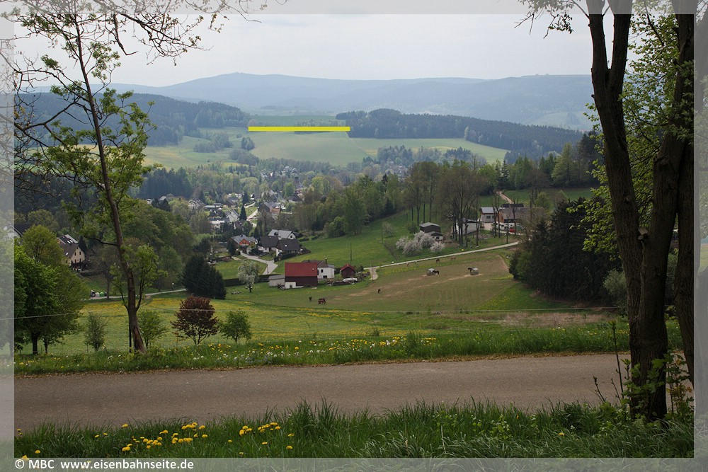 [33] Im Vordergrund liegt das asphaltierte ZS-Planum. Die gelbe Linie markiert die BSg zwischen Scheibenberg und Markersbach unweit des Emmlerweges. Links darüber thront der Fichtelberg, rechts das Oberbecken des Pumpspeicherwerkes. Zwischen beiden Bahnstrecken liegt die Gemeinde Schwarzbach – seit 1996 Elterleiner Ortsteil – in Tallage.[34] An dieser Stelle bietet sich auch der diametrale Blick an: Die gelbe Linie markiert nun die ZS. Der Gegenstandpunkt liegt etwa mittig auf dieser.