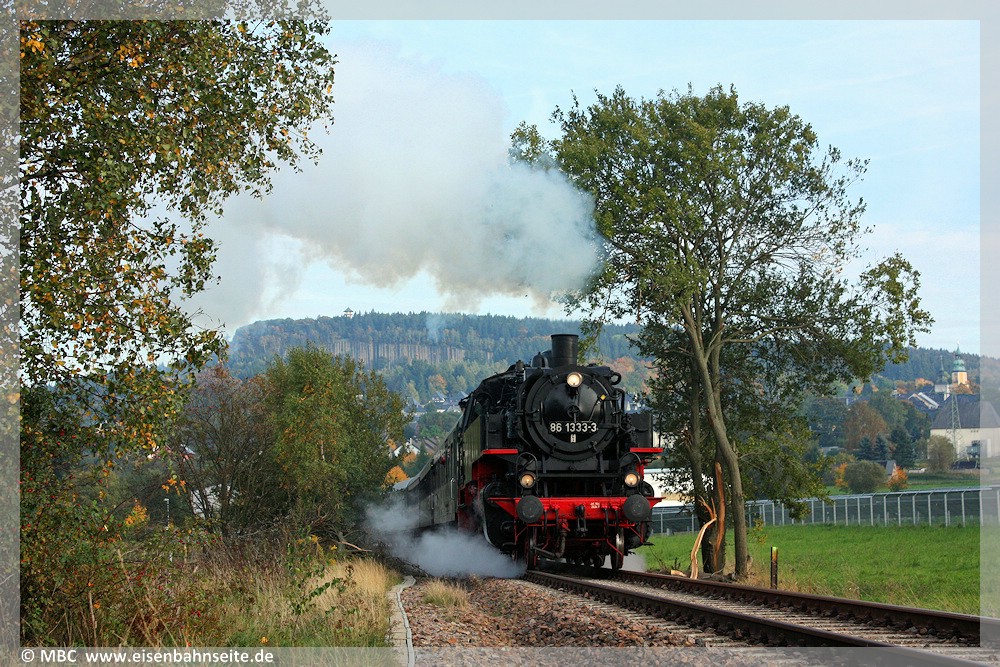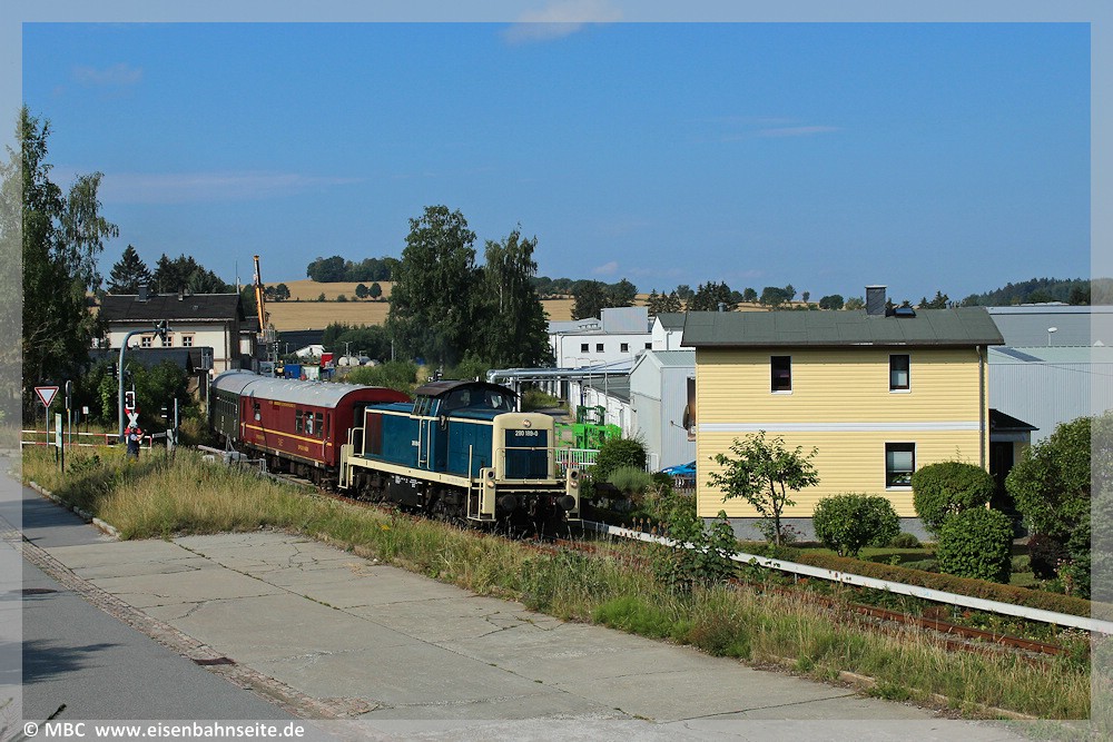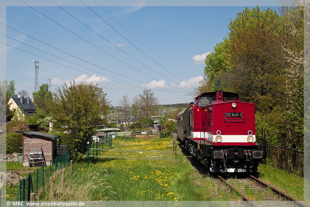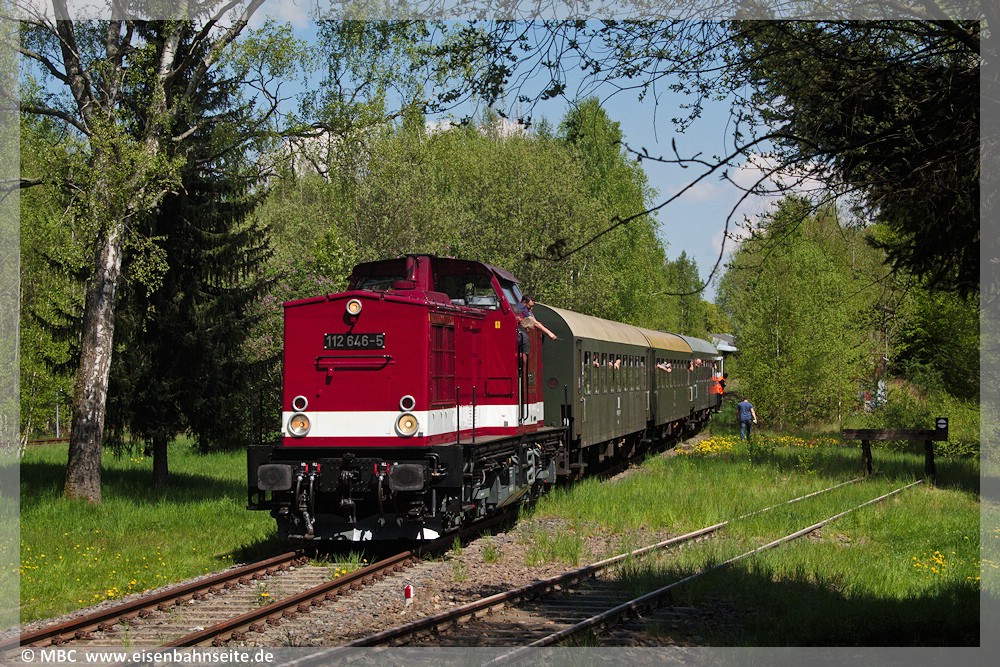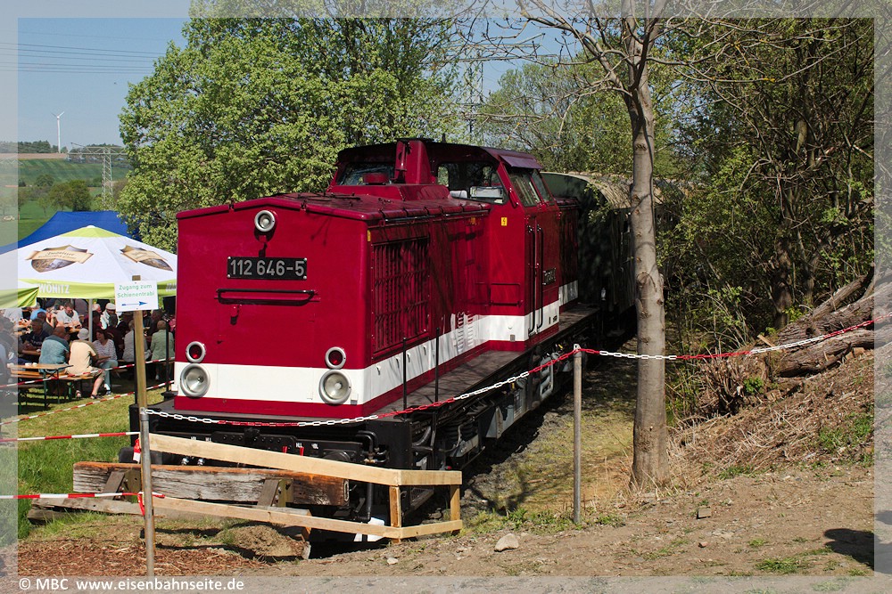 An diesem Donnerstag jährte sich die Aufnahme des Regelbetriebs der Strecke Zwönitz – Elterlein – Scheibenberg zum 125. Mal. Aus diesem Anlass veranstaltete die rührige Interessengemeinschaft Zwönitz – Scheibenberg (IG ZS) mit vielen regionalen Unterstützern eine Festveranstaltung im Zwönitzer Ortsteil Kühnhaide. Dort befindet sich der Endpunkt des Anschlussgleises zur Energieversorgung (Umspannwerk), welches den letzten von Schienenfahrzeugen befahrbaren Rest der ZS darstellt. Außerdem beginnt dort auf der Bahntrasse ein Rad- und Wanderweg zur letzten erhaltenen der sieben stählernen Brücken, der Fuchsbrunnbrücke, welcher im SEV bedient wurde. Die IG ZS errichtet sukzessive einen Lehrpfad entlang der Bahntrasse in Richtung Bernsbach, ausgestattet mit Hinweistafeln und historischen Signaltafeln an Originalstandorten. Von Schlettau zur Festveranstaltung und zurück fuhr ein Sonderzug mit 112 646, welcher mangels Gleis den Umweg über Aue nahm.
